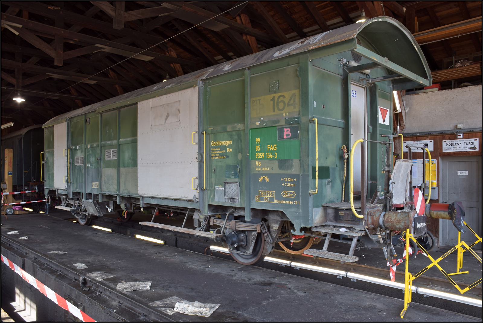 Der ehemalige Sihltalbahnwagen darf leider beim Jubiläum nicht mitmachen und steht schmollend im Depot Bauma. Er trägt die Nummer C 105 und war von der Sihlthalbahn als C 26 beschafft worden. Er wurde vermutlich 1898 von der SIG in Neuhausen gebaut. September 2025. km0