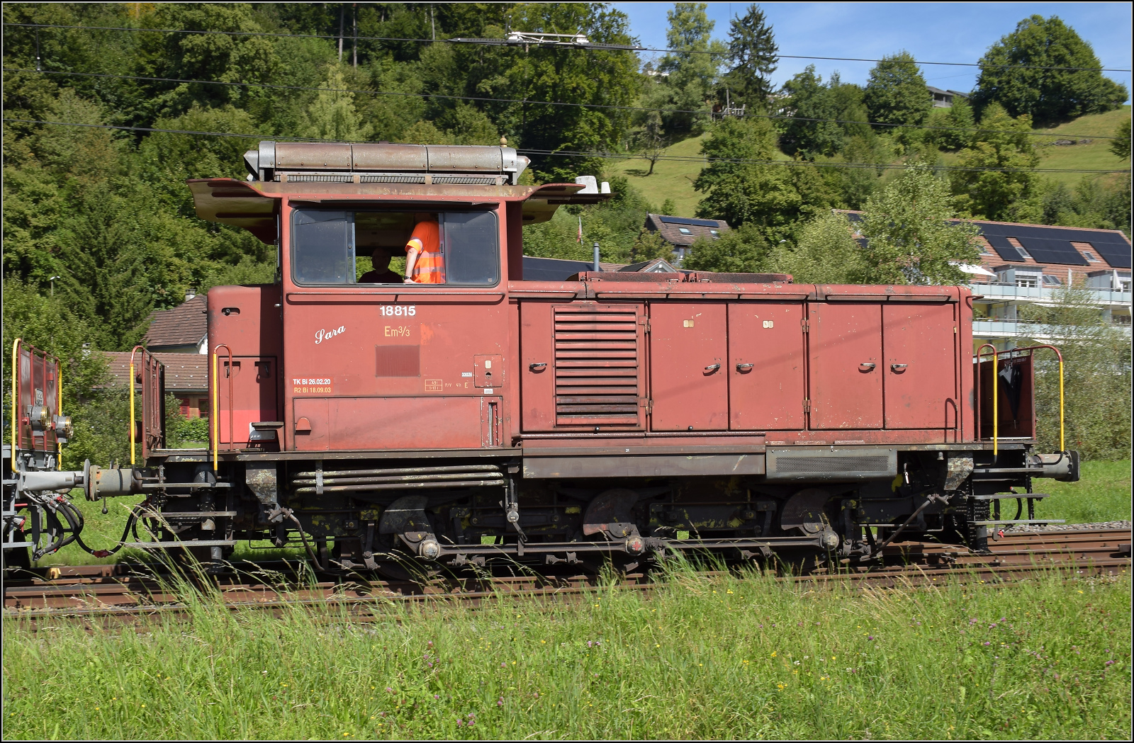 Em 3/3 18815 'Sara' ist neu beim DVZO und hat am Jubliäum alle Hände voll zu tun, um bei den Rangierarbeiten in Bauma behilflich zu sein. Denn anderes als Hinwil ist die Bahnhofshalle in Bauma ein Sackbahnhof für die Museumszüge. September 2025. km0