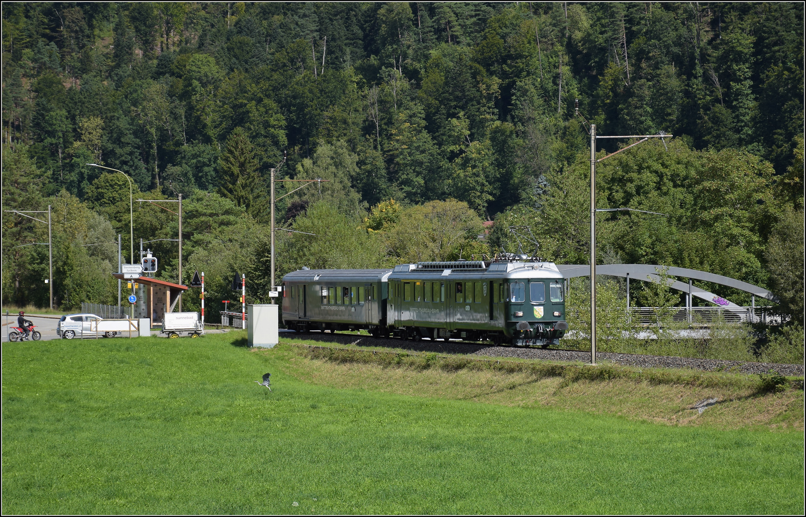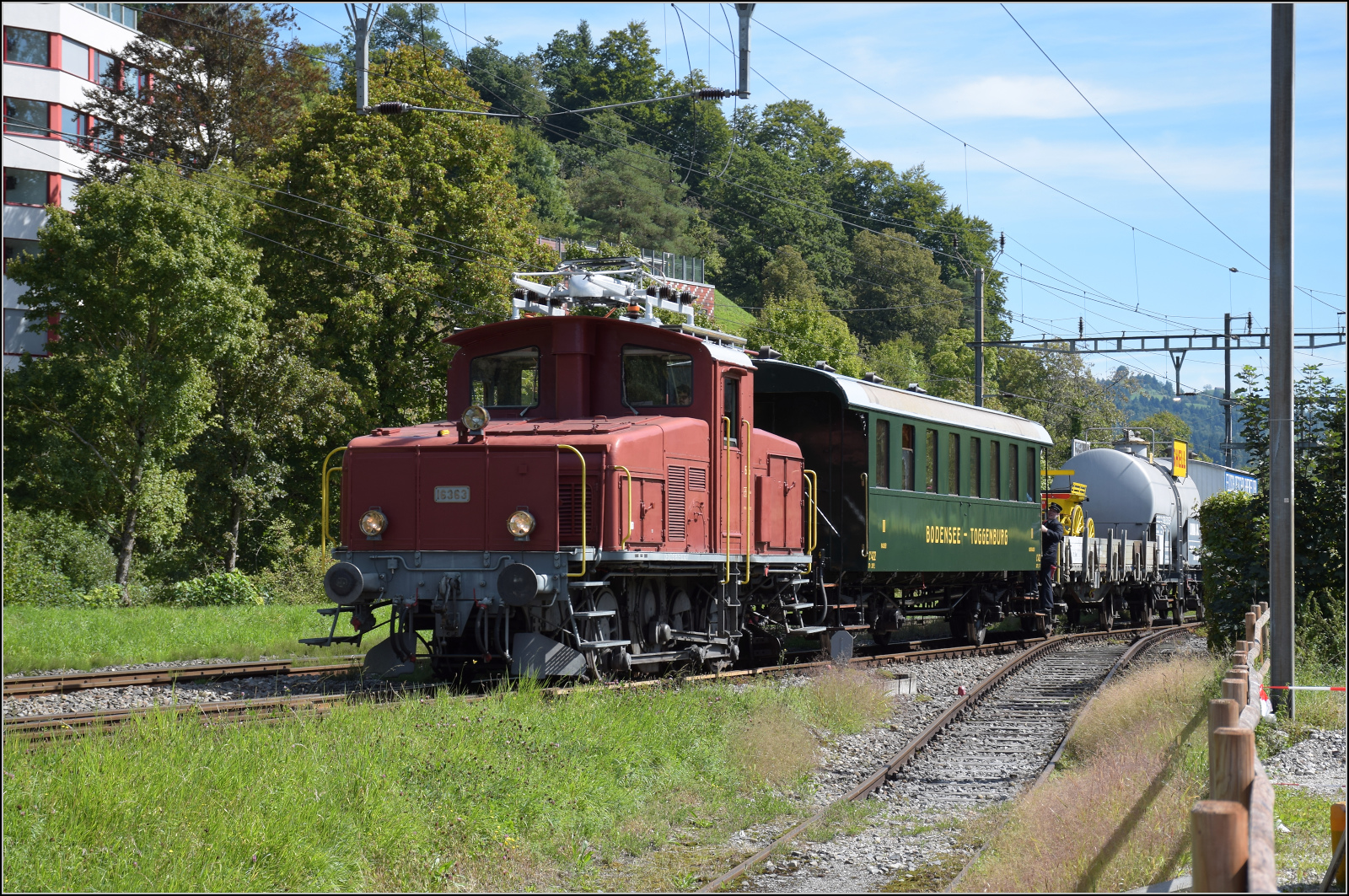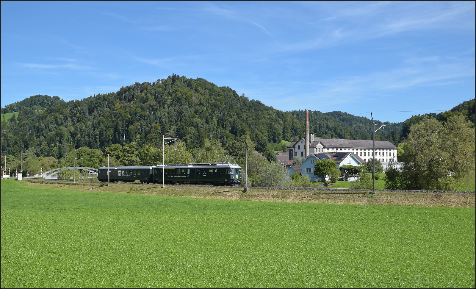 Der ABDe 4/4 12 'Weinfelden' des Vereins historische Mittelthurgaubahn unterwegs bei Juckeren auf der Tösstalbahn. Nicht ganz vorbildgetreu ist der Steuerwagen BDt 205, denn bei der MThB hatten die Triebwagen das Gepäckabteil und nicht der EW I-Steuerwagen. Wie dem auch sein, das Gespann sieht trotzdem nett und gepflegt aus. Das war es auch schon von den Bildern auf der Jubilarin, das meiste Geschehen fand in Bauma und abseits des Regelverkehrs auf der jüngeren Museumsstrecke der UeBB statt. September 2025. km0