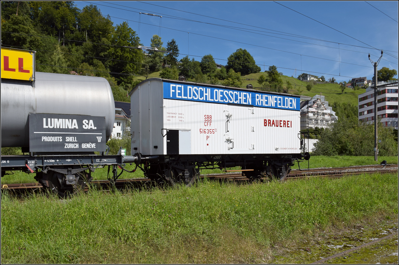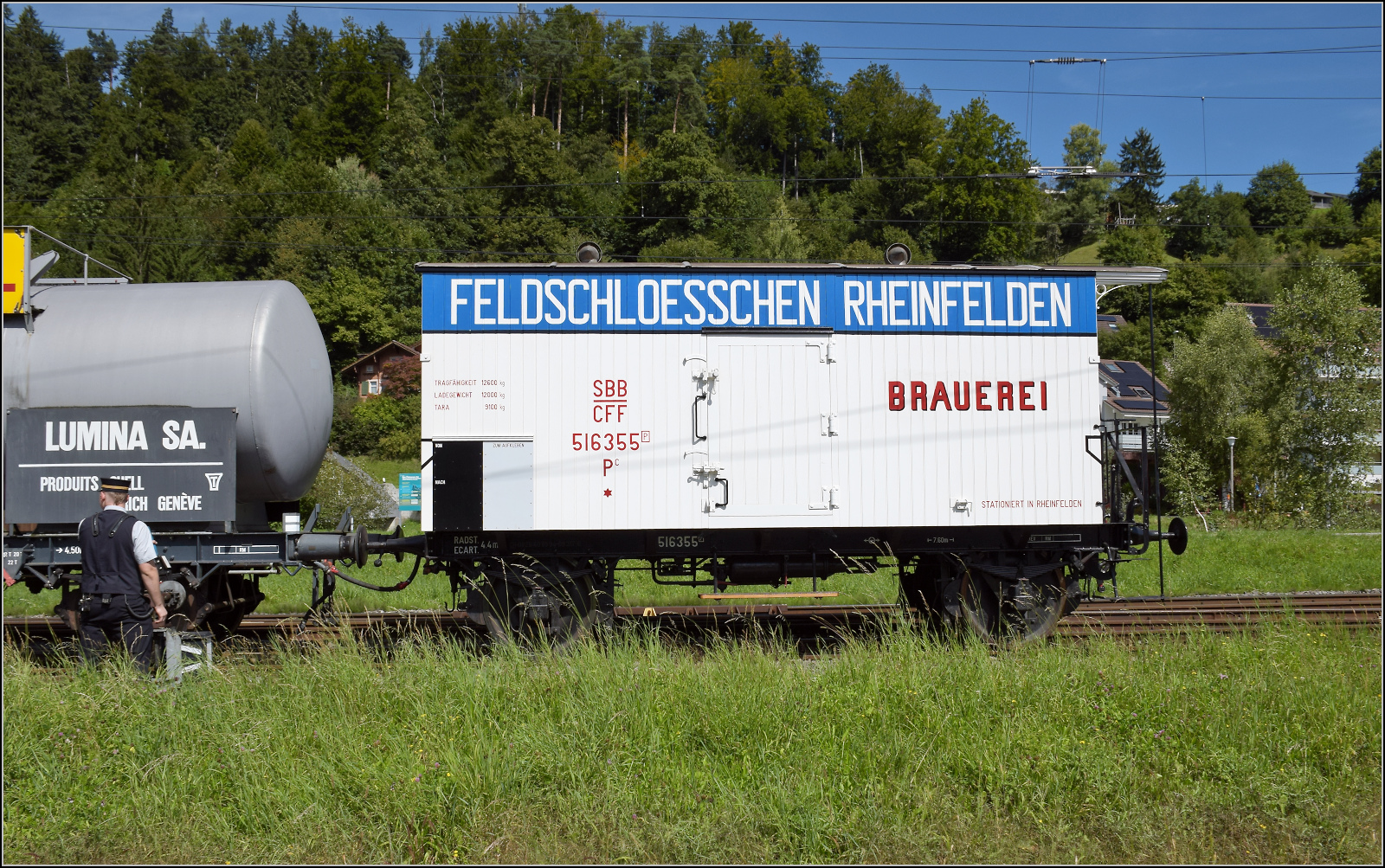 Der Brauereiwagen Pc OG 1 'Feldschlösschen' wurde 1898 von der SIG Neuhausen an die Nordostbahn geliefert und wurde mit der NOB 1902 in die SBB eingegliedert. 1922 erhielt er die Nummer Pc 513 355 und war bis 1967 im Einsatz. Zum DVZO kam er 2010, was ihm sicher nicht nur äusserlich sehr gut getan hat. Hier im Einsatz im GmP mit Ee 3/3 16363. Bauma, September 2025. km0