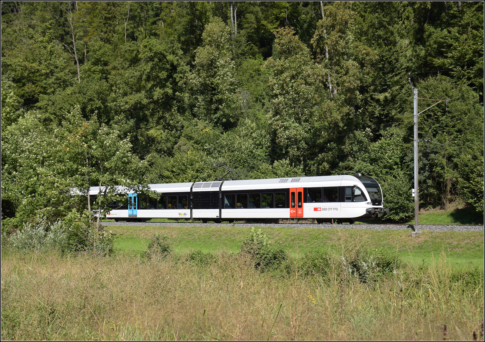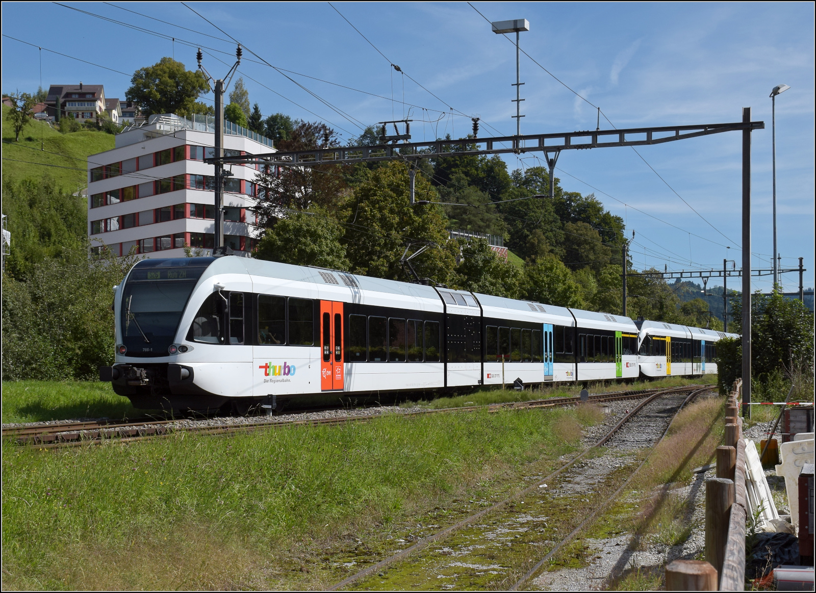 RABe 526 766 und RABe 526 775 fahren in Kollbrunn am Betrachter vorüber. Ein Bild des Alltgas mit den üblichen GTW an einer Stelle, die den Charakter der Tösstalbahn im oberen Tösstal passend darstellt. September 2025. km0