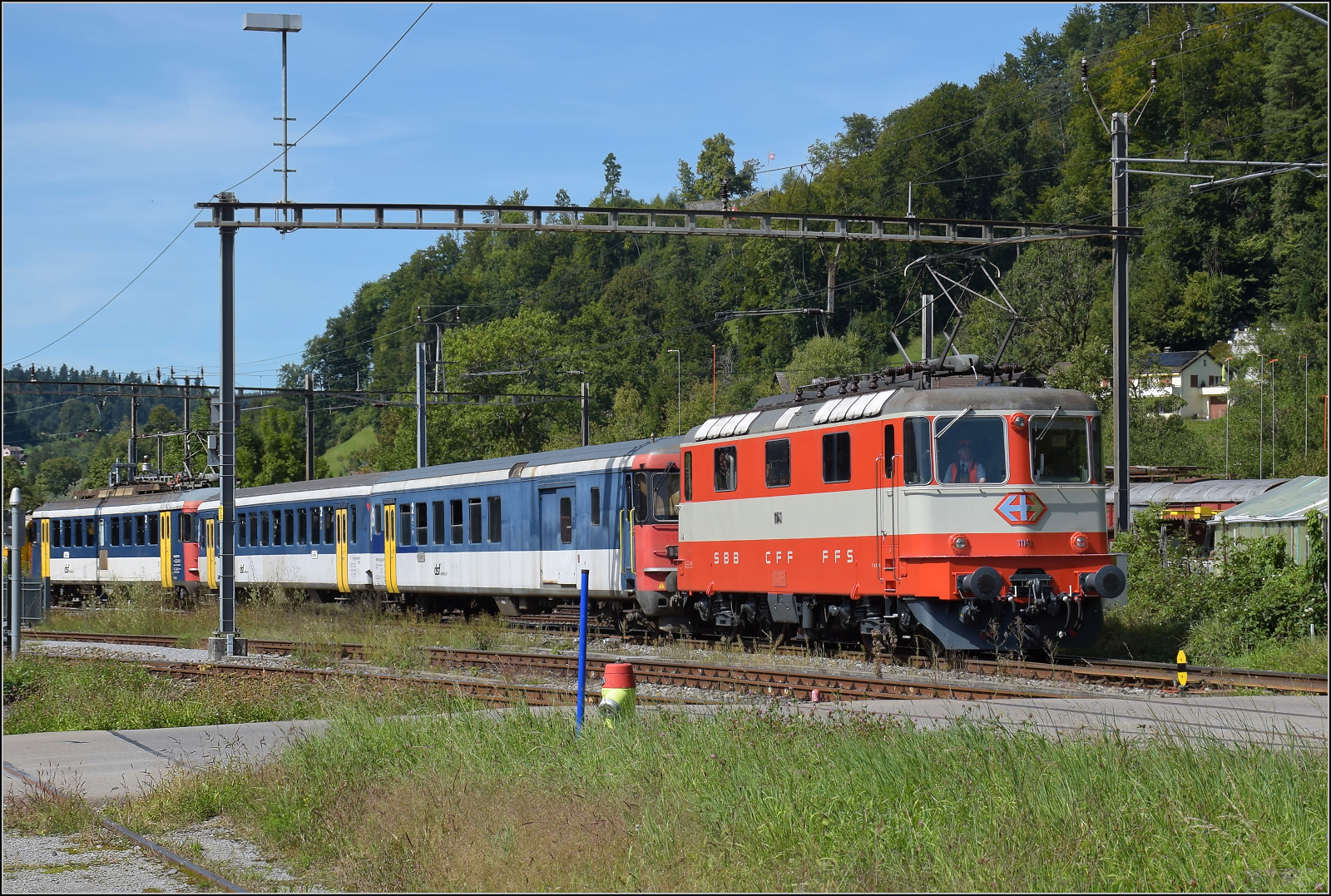 Die Swiss-Express-Lok Re 4/4 II 11141 muss an diesem Tag RBe 540 074 als Steuerwagenersatz unterstützen. Der etwas schräge Pendelzug warte in Bauma auf seinen nächsten Einsatz auf der eigentlichen Jubilarin. September 2025. km0