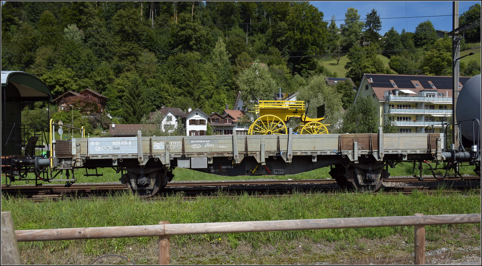 Ein Flachwagen aus dem Jahr 1953 mit unbekanntem Hersteller erscheint mir reichlich skurril, aber ok, 99 85 9559 476-8 CH-DVZO transportiert sehr wichtiges Ladegut. Hier im Einsatz im GmP mit Ee 3/3 16363. Bauma, September 2025. km0