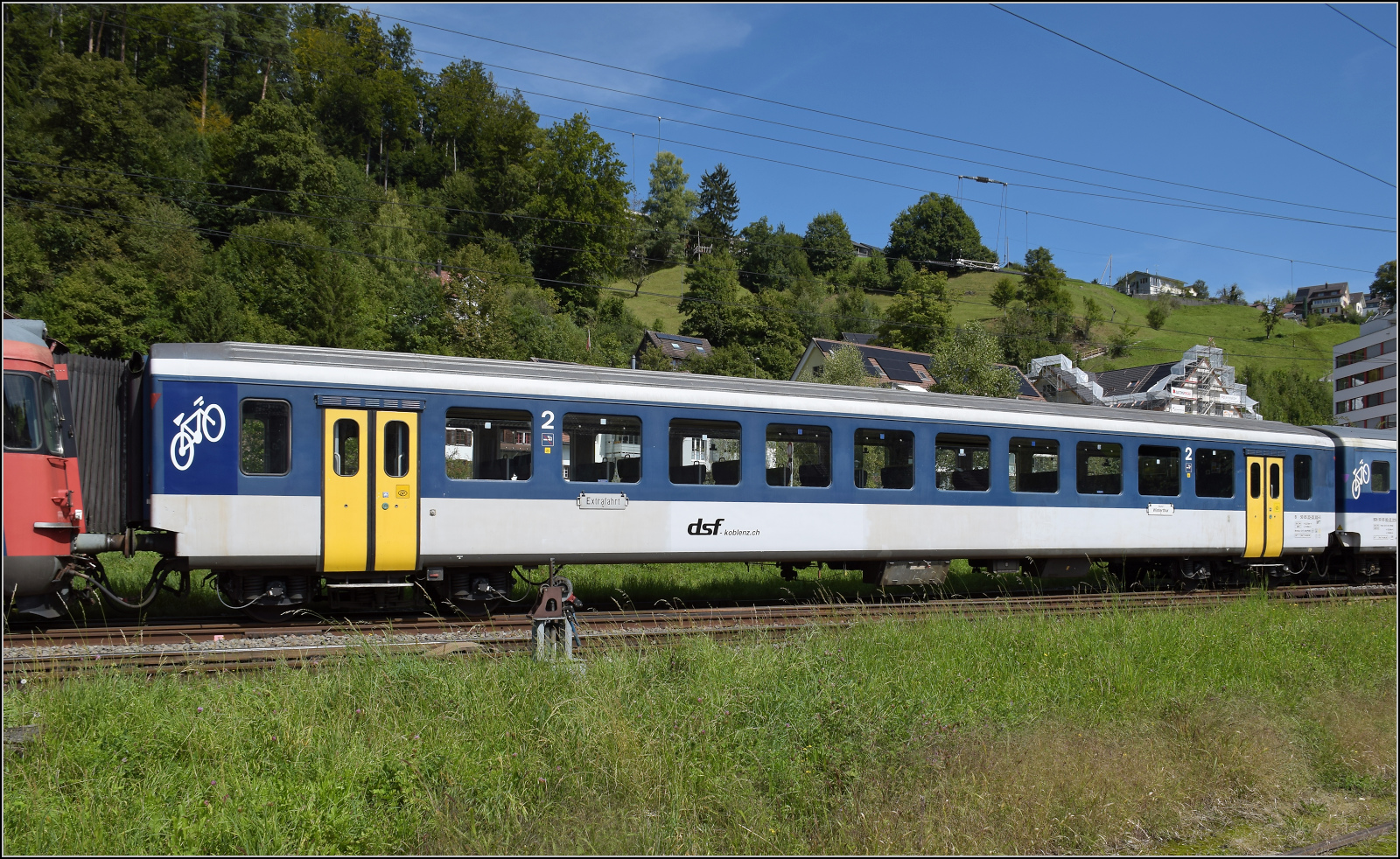 Im Pendelzug mit Swiss-Express-Lok Re 4/4 II 11141 und RBe 540 074 ist auch der Einheitswagen I mit der Nummer B 50 85 20-35 305-5 eingereiht. Der etwas schräge Pendelzug rangiert in Bauma, um sich auf die Fahrt auf der eigentlichen Jubilarin zu begeben. September 2025. km0