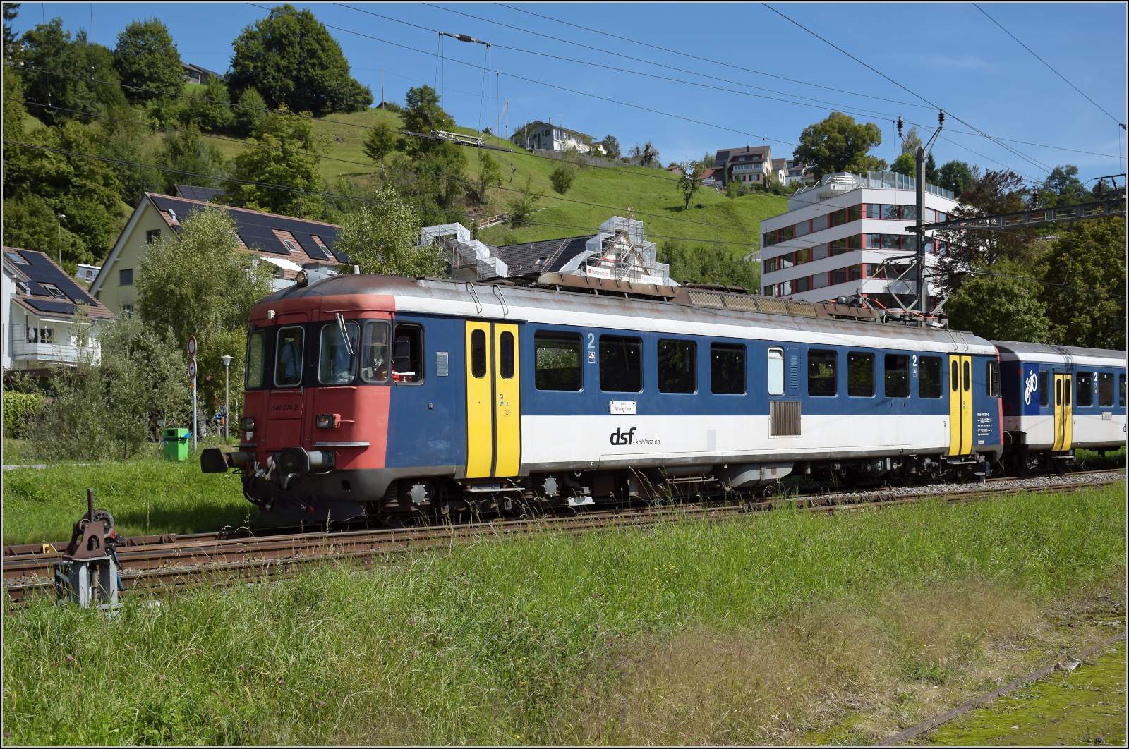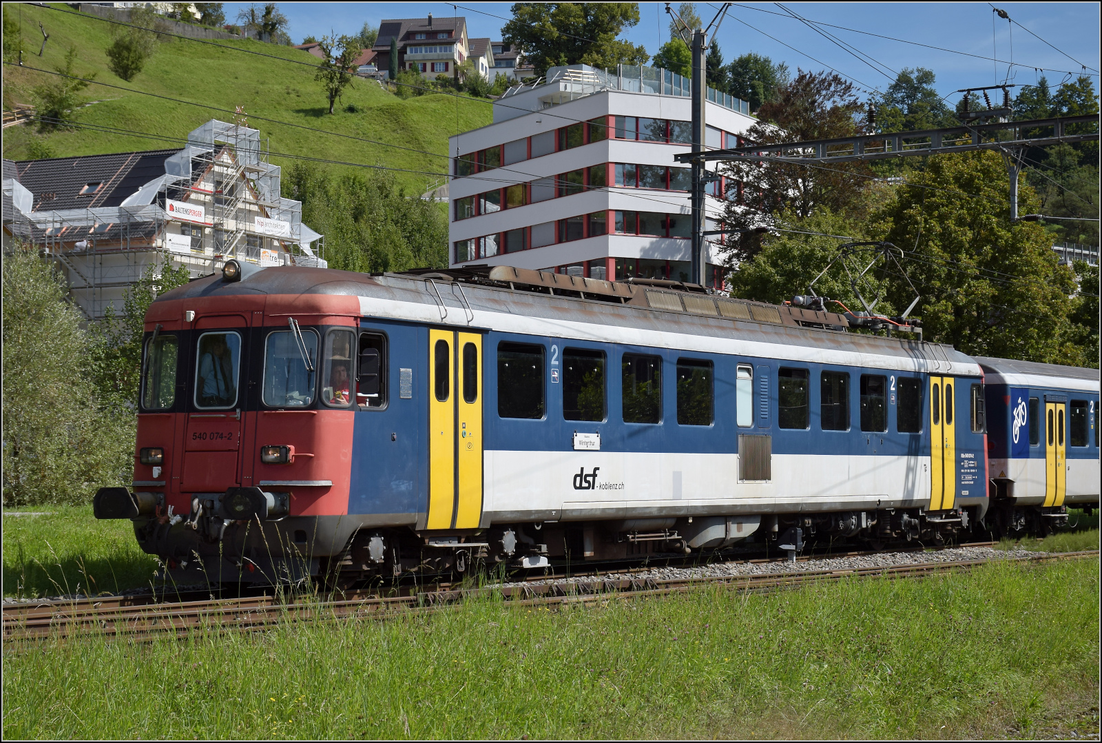 RBe 540 074 rangiert in Bauma mit ihrem etwas schrägen Pendelzug, um sich auf die Fahrt auf der eigentlichen Jubilarin zu begeben. September 2025. km0