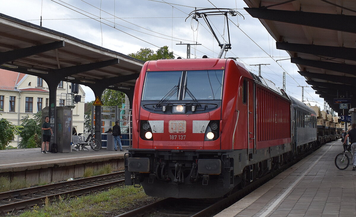 DB Cargo AG, Mainz [D] mit ihrer "187 137" [NVR-Nummer: 91 80 6187 137-5 D-DB] und einem Militärtransportzug mit US-amerikanischen Militärfahrzeugen am 18.09.25 Durchfahrt Bahnhof Magdeburg-Neustadt. Lothar Stöckmann