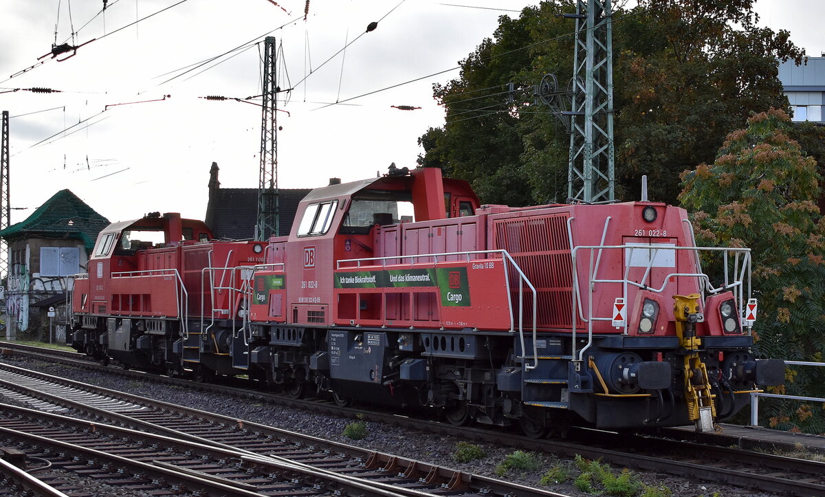 DB Cargo AG, Mainz mit den beiden Voith Gravita 10 BB Lok "261 022-8" (NVR: "92 80 1261 022-8 D-DB") am Haken von "261 100-2" (NVR: "92 80 1261 100-2 D-DB") am 18.09.25 Höhe Bahnhof Magdeburg-Neustadt. Lothar Stöckmann