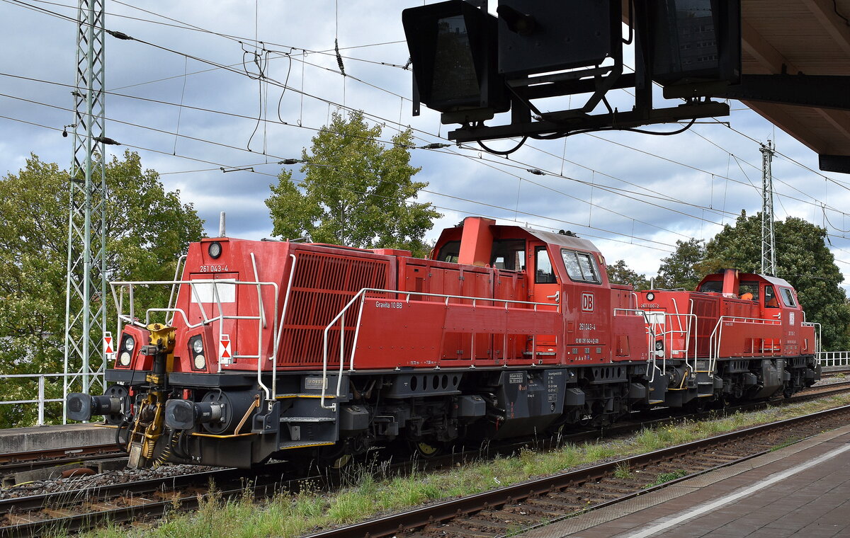 DB Cargo AG, Mainz mit den beiden Voith Gravita 10 BB Lok "261 043-4" (NVR: "92 80 1261 043-4 D-DB") am Haken von "261 100-2" (NVR: "92 80 1261 100-2 D-DB") am 18.09.25 Höhe Bahnhof Magdeburg-Neustadt. Lothar Stöckmann