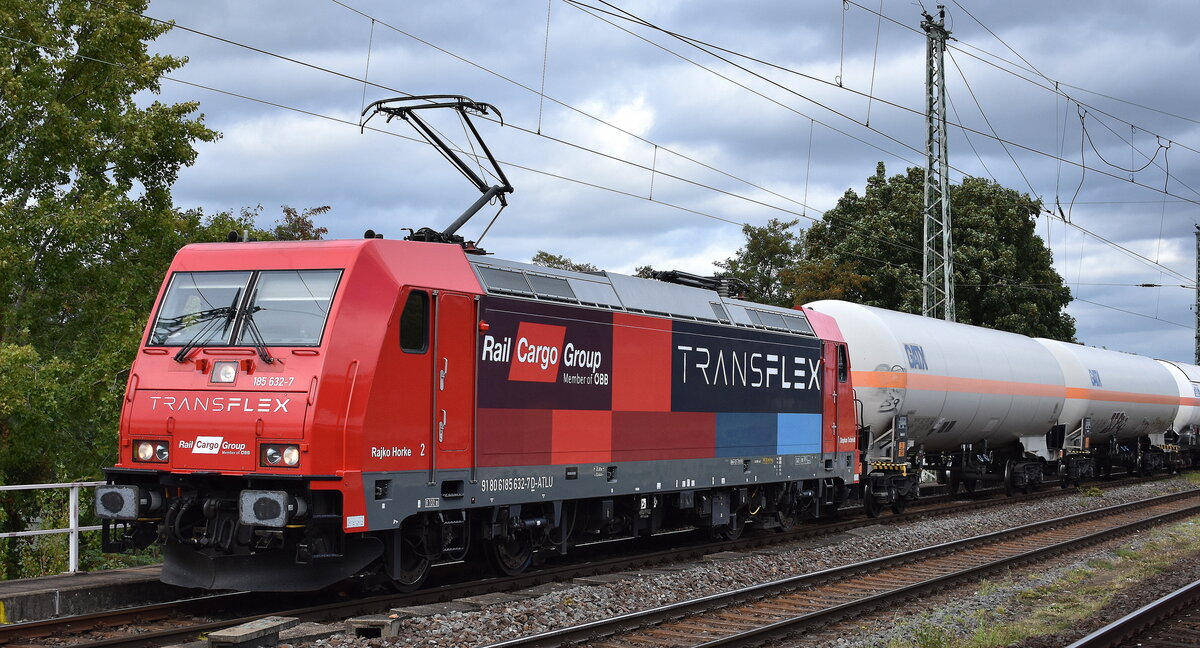RCL - Rail Cargo Logistics - Germany GmbH, Frankfurt (Main) mit der geleasten schön folierten "185 632-7" [NVR-Nummer: 91 80 6185 632-7 D-ATLU] und einem Ganzzug Druckgaskesselwagen (Kohlenwasserstoffgas) am 18.09.25 Höhe Bahnhof Magdeburg-Neustadt. Lothar Stöckmann