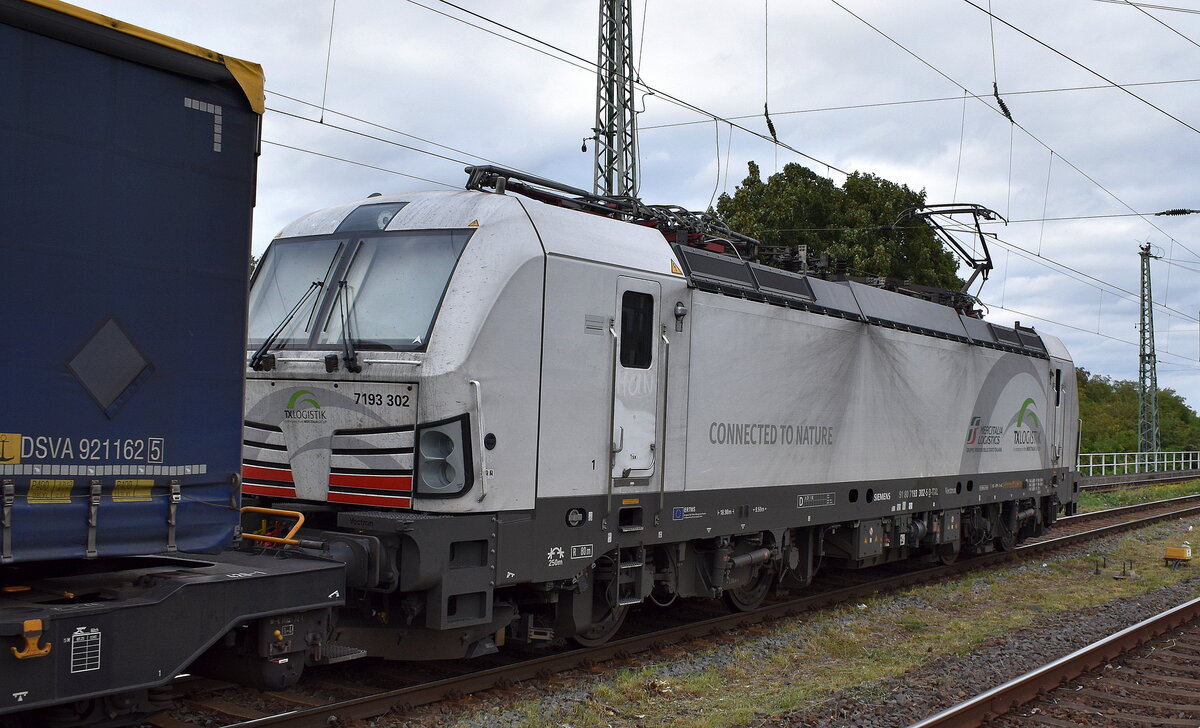 TX Logistik AG, Bad Honnef [D] mit ihrer Vectron "7193 302" [NVR-Nummer: 91 80 7193 302-5 D-TXL] und einem KLV-Zug Richtung Rostock Seehafen am 18.09.25 Höhe Bahnhof Magdeburg-Neustadt.