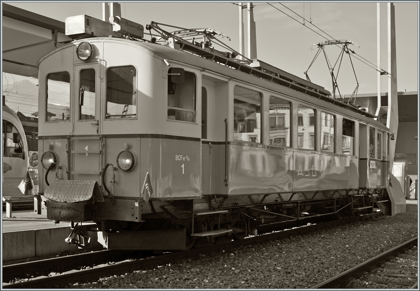 Die Association ASD 1914 bot für den Samstag Nachmittag einen Zug zum Jassen (Kartenspielen) an. Zwar sehe ich den Zweck nicht, im Zug Karten zu spielen, aber es bot sich mir die schöne Gelegenheit, den ASD BCFe 4/4 N° 1 wieder einmal im Einsatz zu sehen und dieses Mal auf der ASD. Da für den Nachmittag Nebel angesagt war, wollte ich den "Jass-Zug" im Bahnhof von Aigle fotografieren, war aber dann etwas enttäuscht, dass er (fototechnisch) ziemlich ungeschickt stand.
