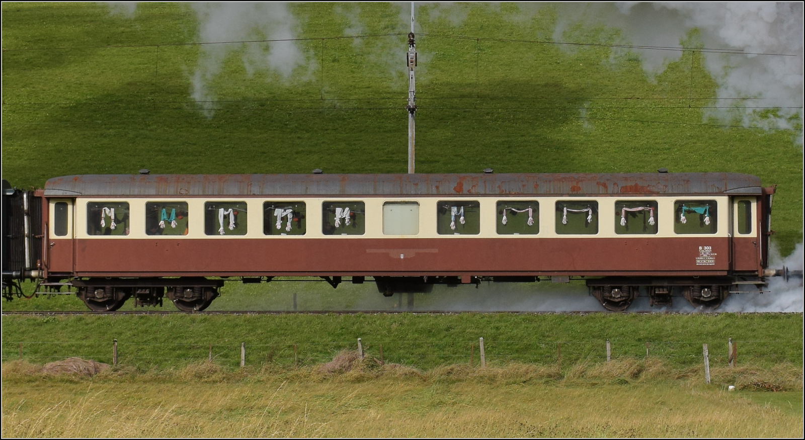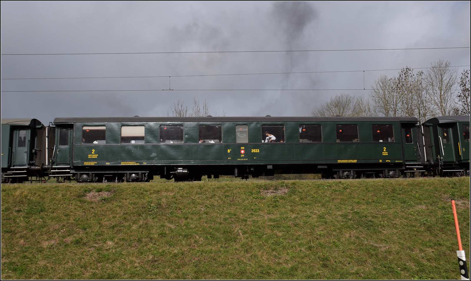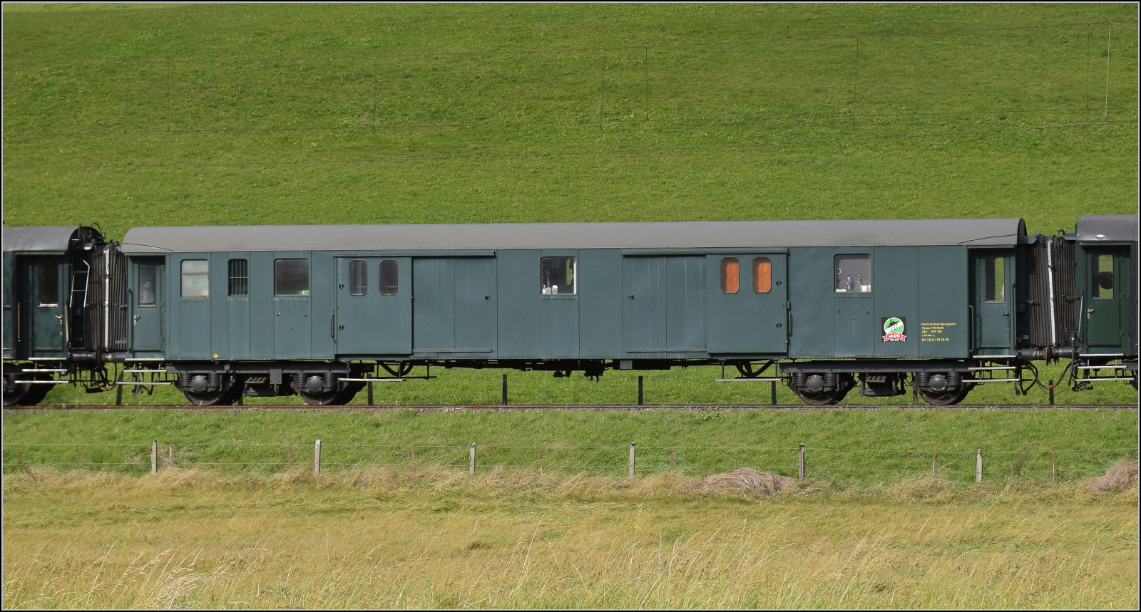Der schwere Stahlwagen B4ü 3933 in genieteter Bauweise fährt mit dem Halloweenzug aus Les Verrières aus. Oktober 2025. km0