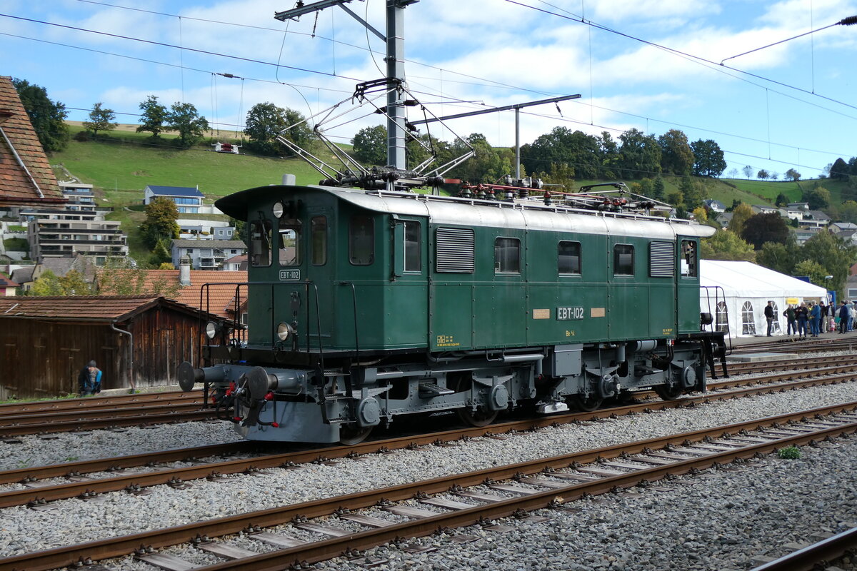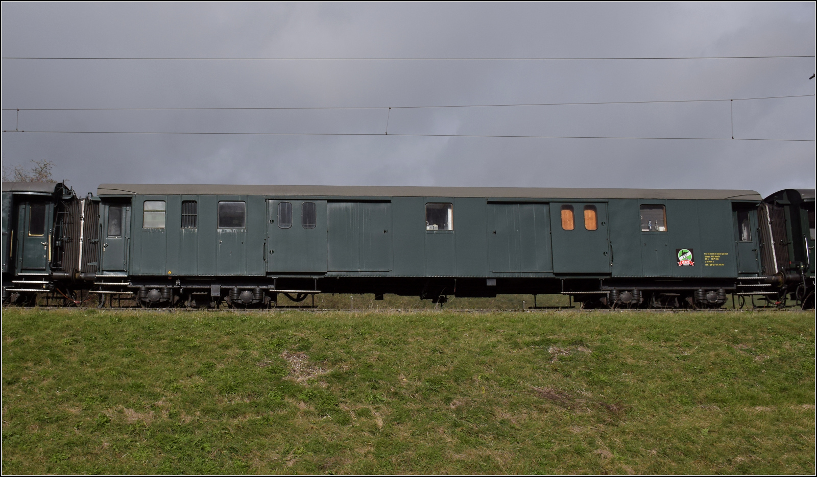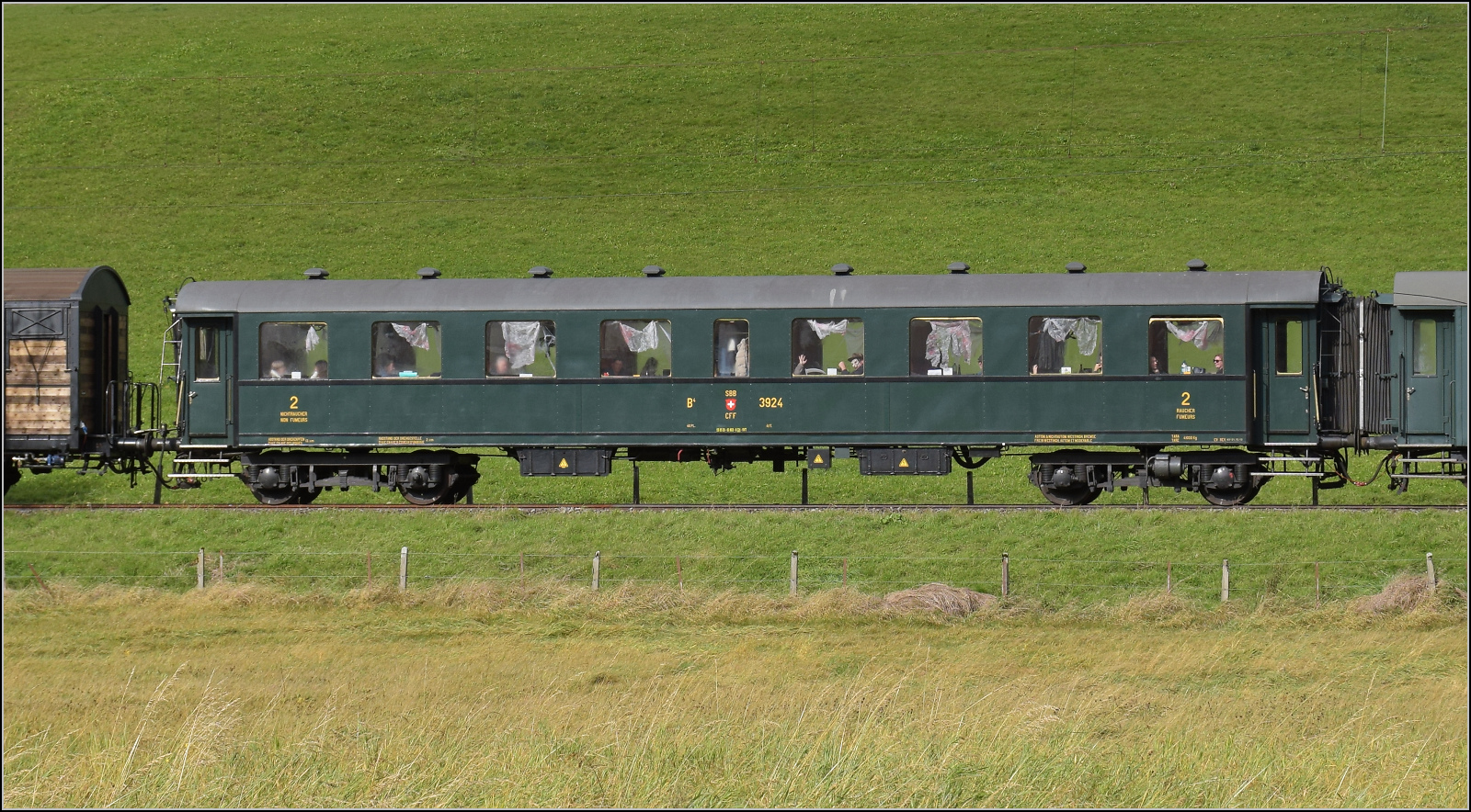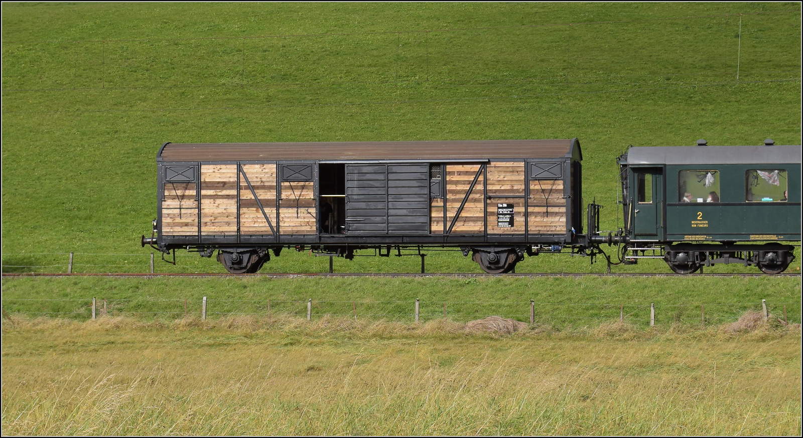 Der schwere Stahlwagen B4ü 3933 in genieteter Bauweise fährt mit dem Halloweenzug aus Les Verrières aus. Oktober 2025. km0