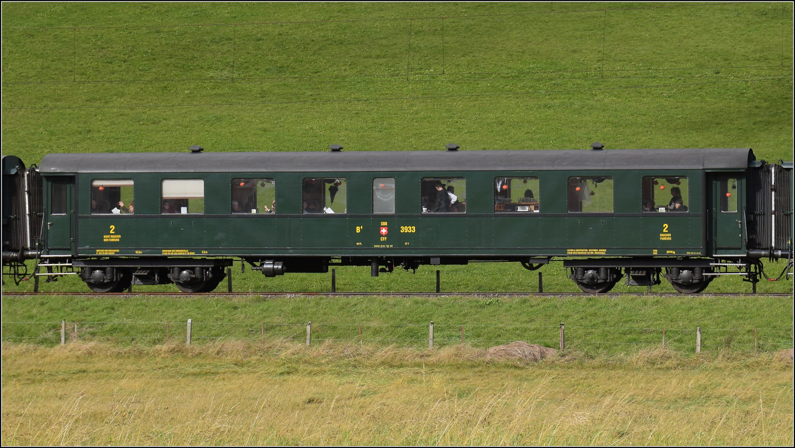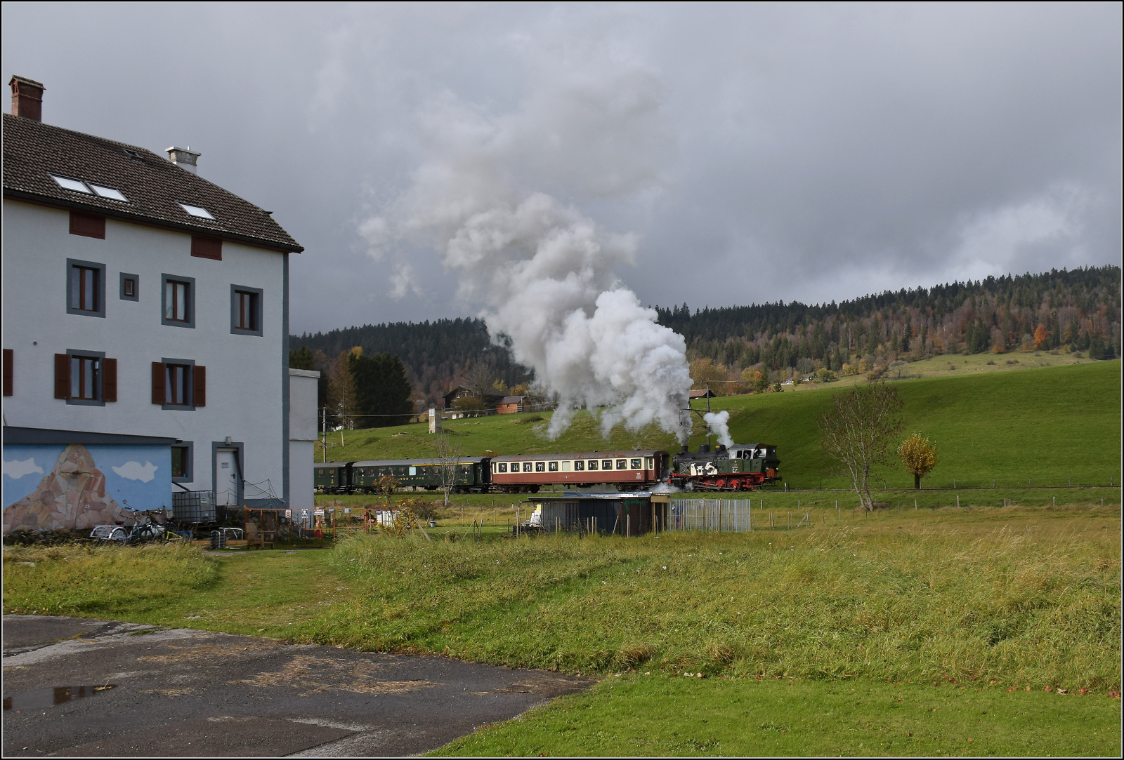 Der schwerer Stahlwagen B4ü 3933 in genieteter Bauweise fährt mit dem Halloweenzug aus Les Verrières aus. Oktober 2025. km0