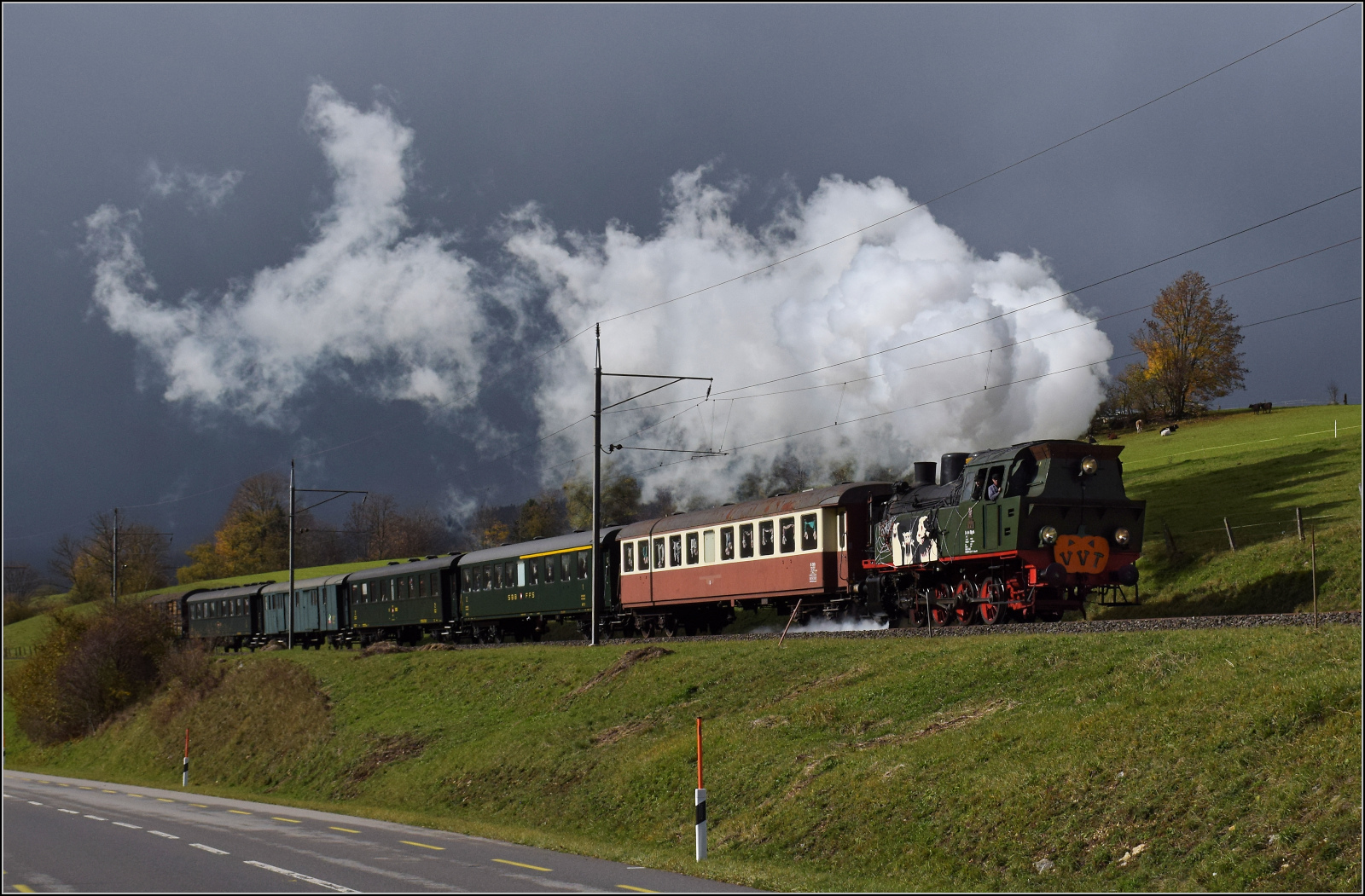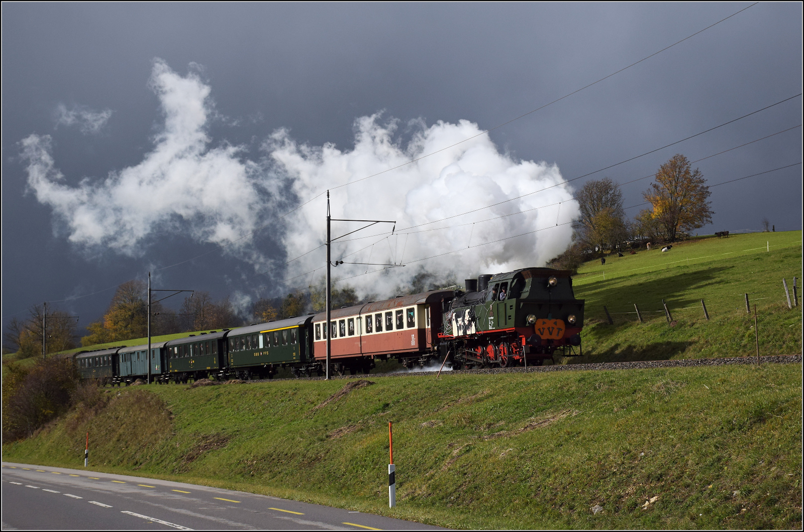 Gruseln zwischen Asphalt und Absinth. TKp 16 'Śląsk' fährt mit ihrem Halloweenzug über den Scheitelpunkt der Strecke. Les Perrosettes, Oktober 2025. km0