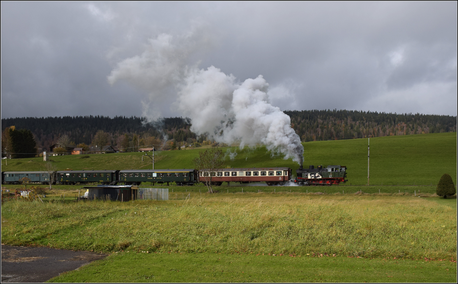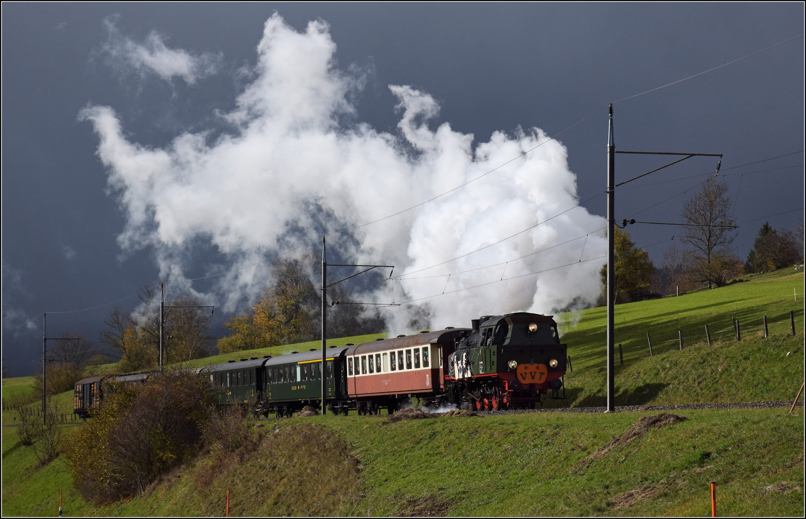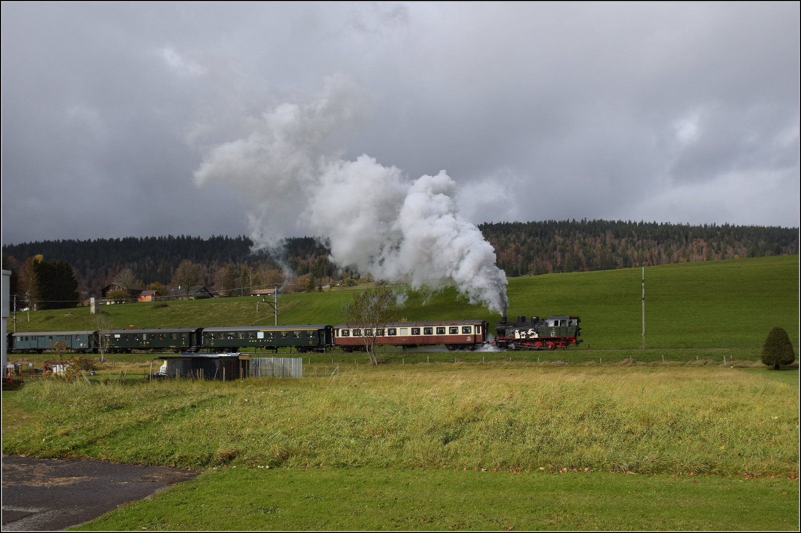 TKp 16 'Śląsk' fährt mit ihrem Halloweenzug über den Scheitelpunkt der Strecke. Les Perrosettes, Oktober 2025. km0