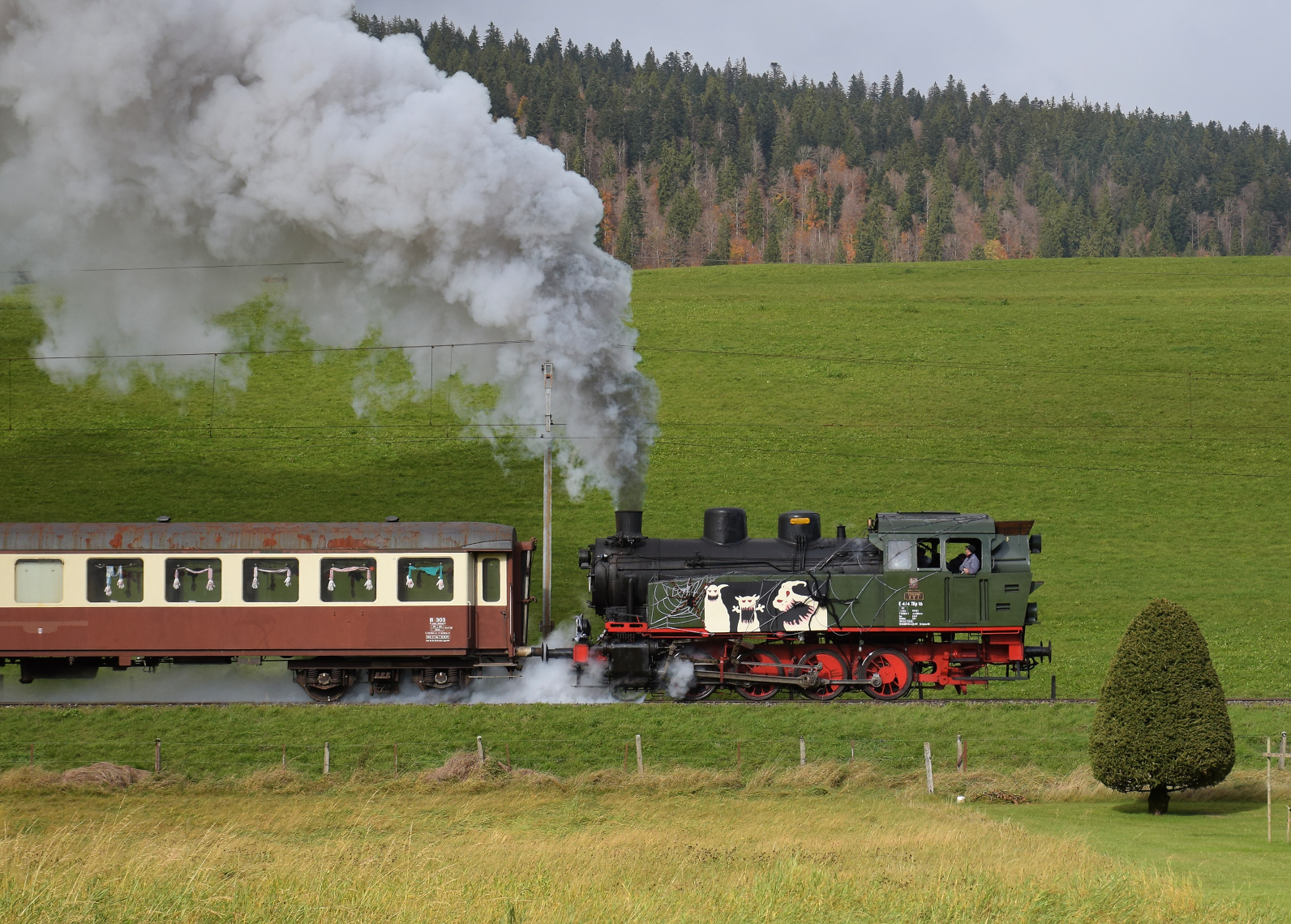 Der schwerer Stahlwagen B4ü 3933 in genieteter Bauweise fährt mit dem Halloweenzug am Hochmoor Les Tourbières vorbei. Oktober 2025. km0