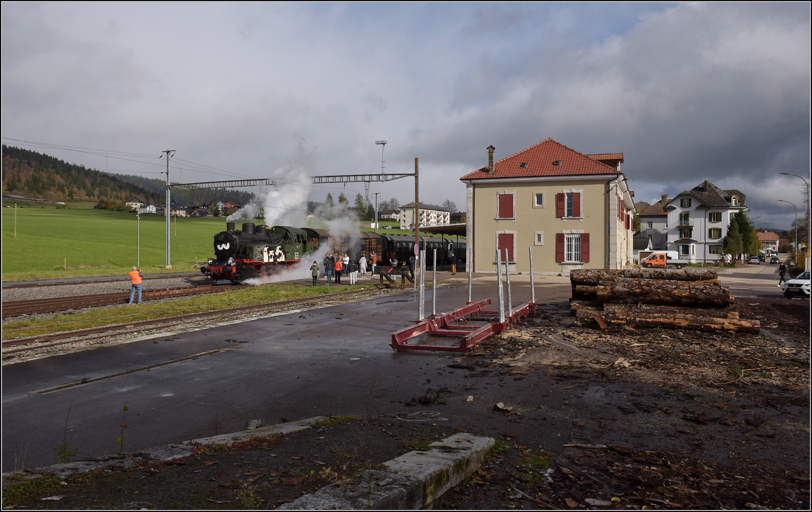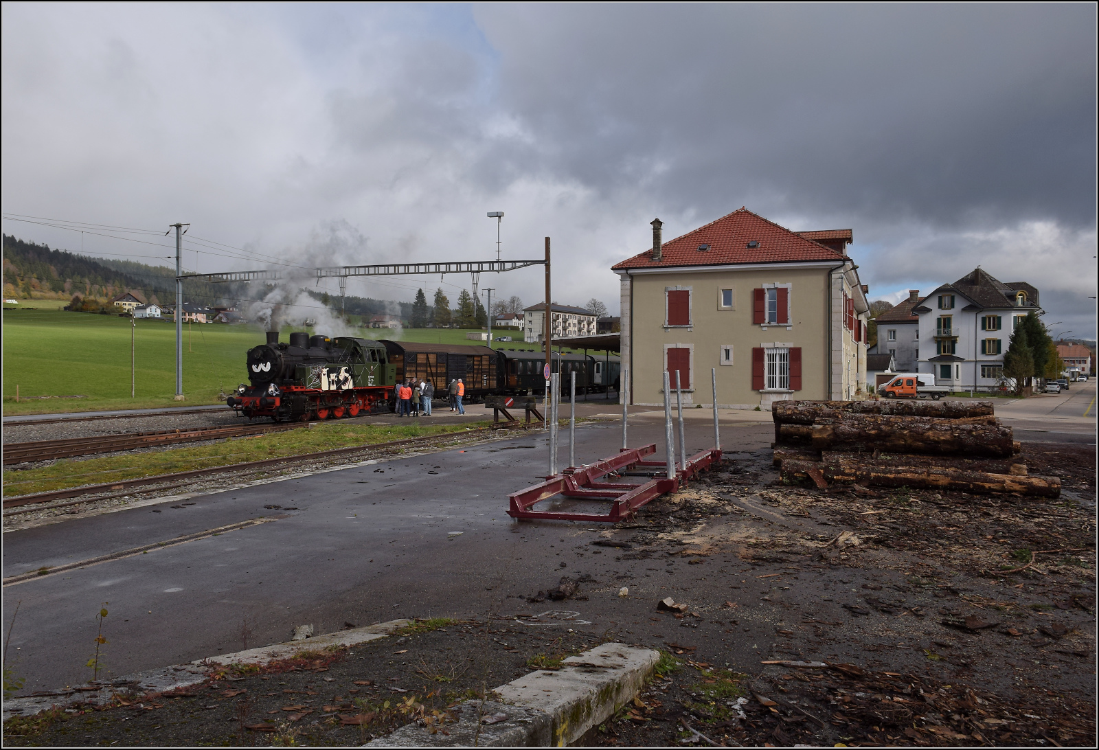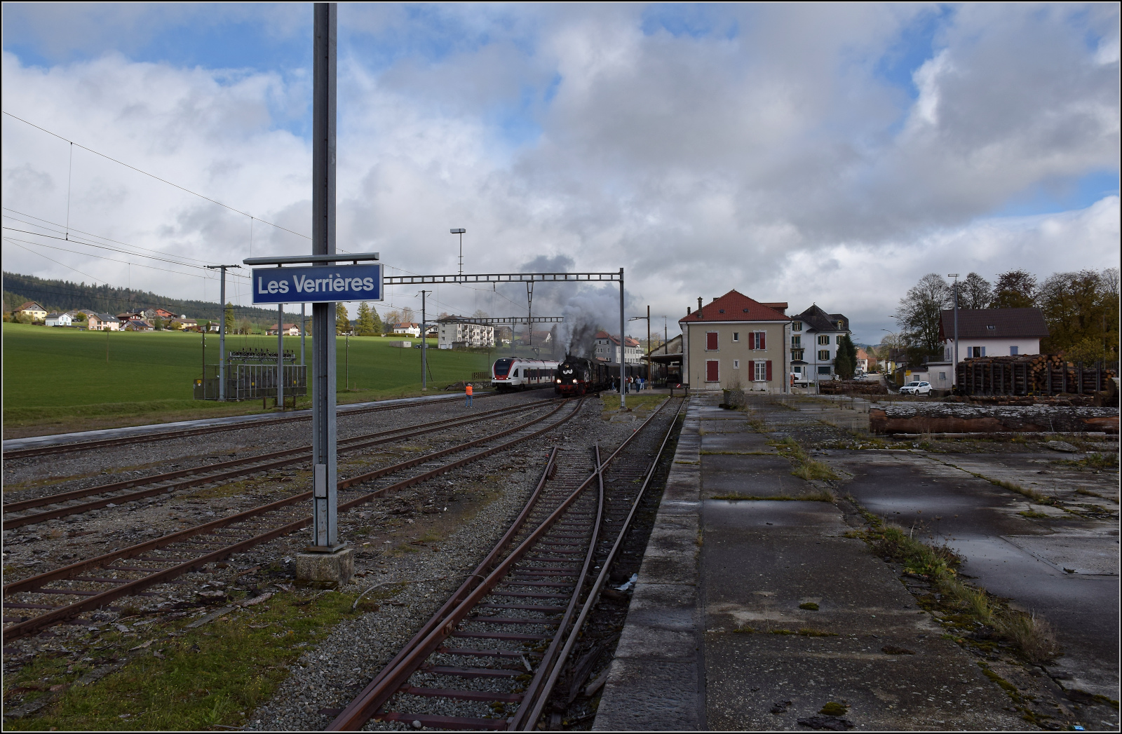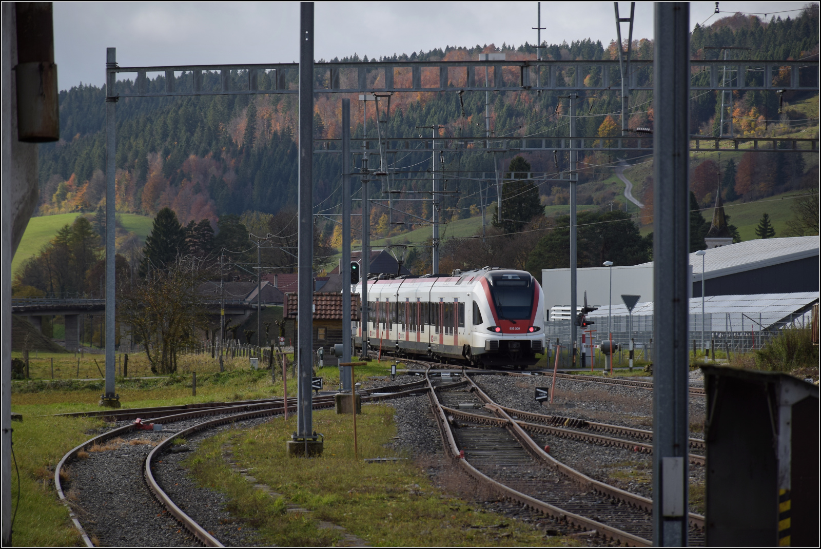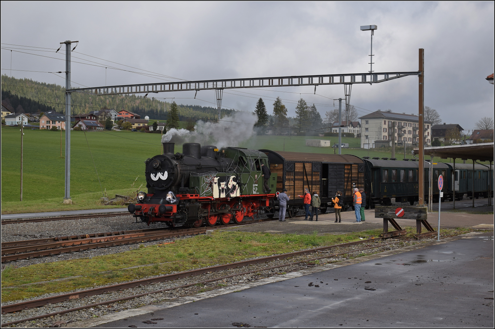 Gruseln zwischen Asphalt und Absinth. Der Regelzug mit RABe 522 205 von Neuchâtel nach Pontarlier fährt in Les Verrières vorbei. Oktober 2025.