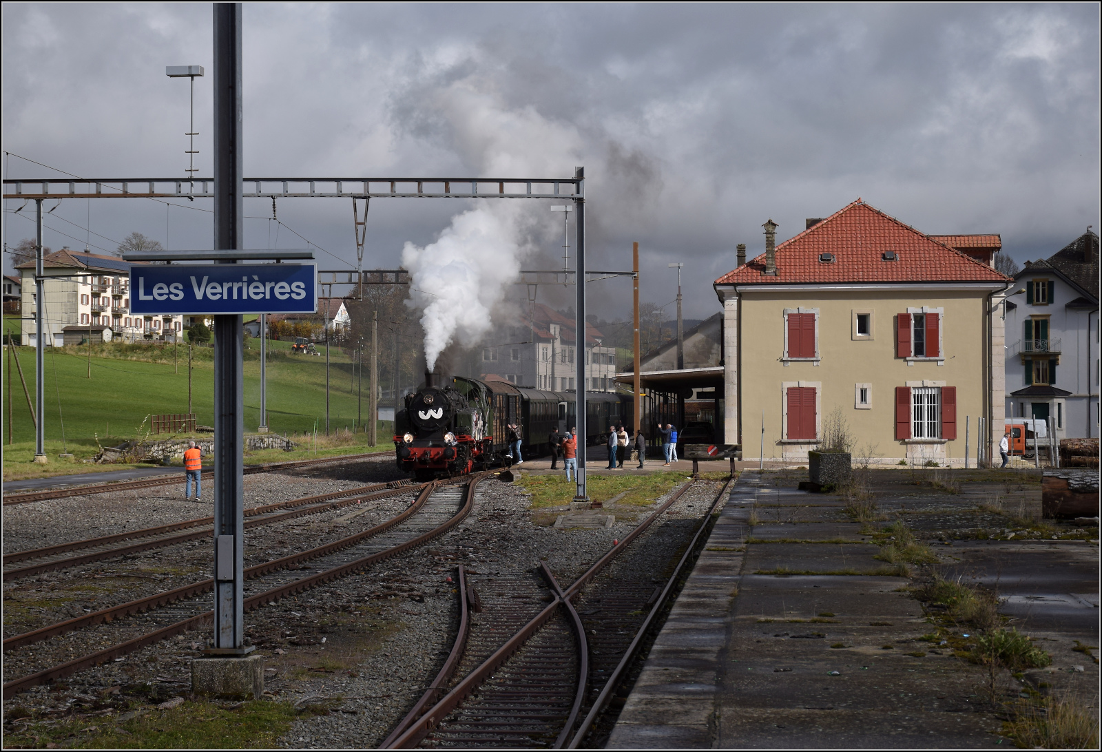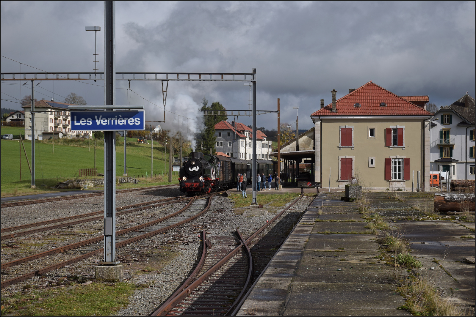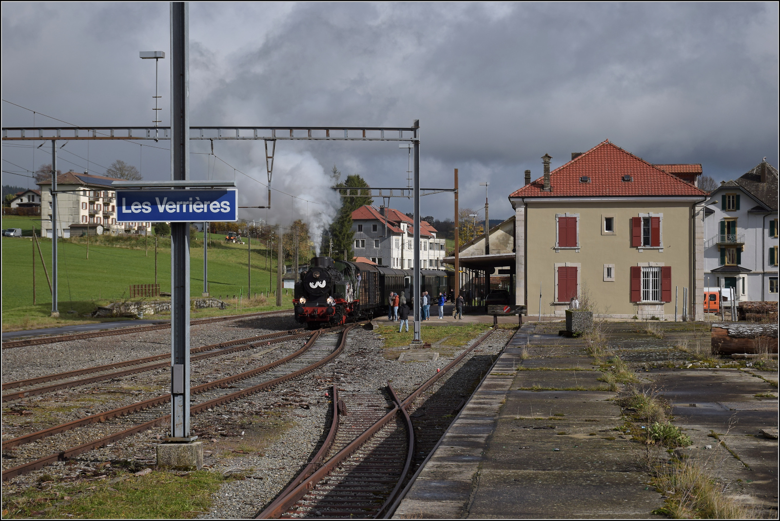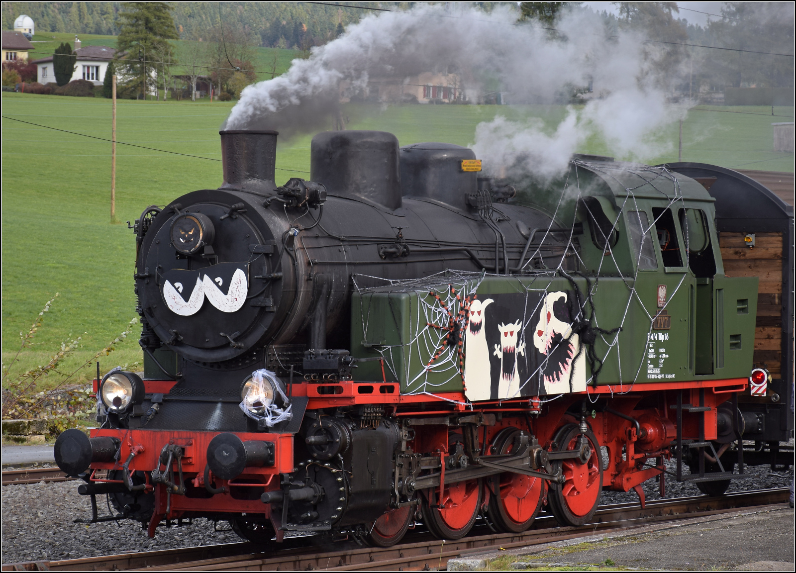 Gruseln zwischen Asphalt und Absinth. Der Regelzug mit RABe 522 205 von Neuchâtel nach Pontarlier fährt in Les Verrières vorbei. Oktober 2025.