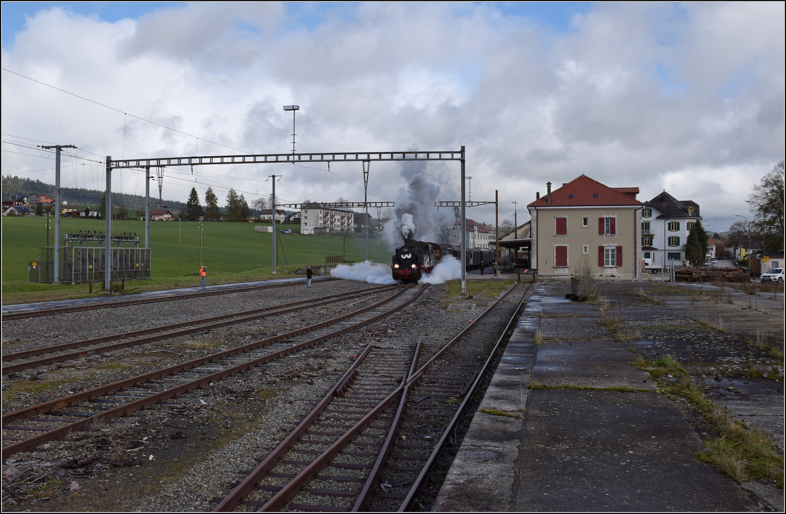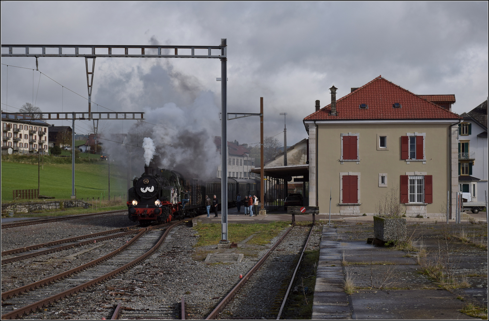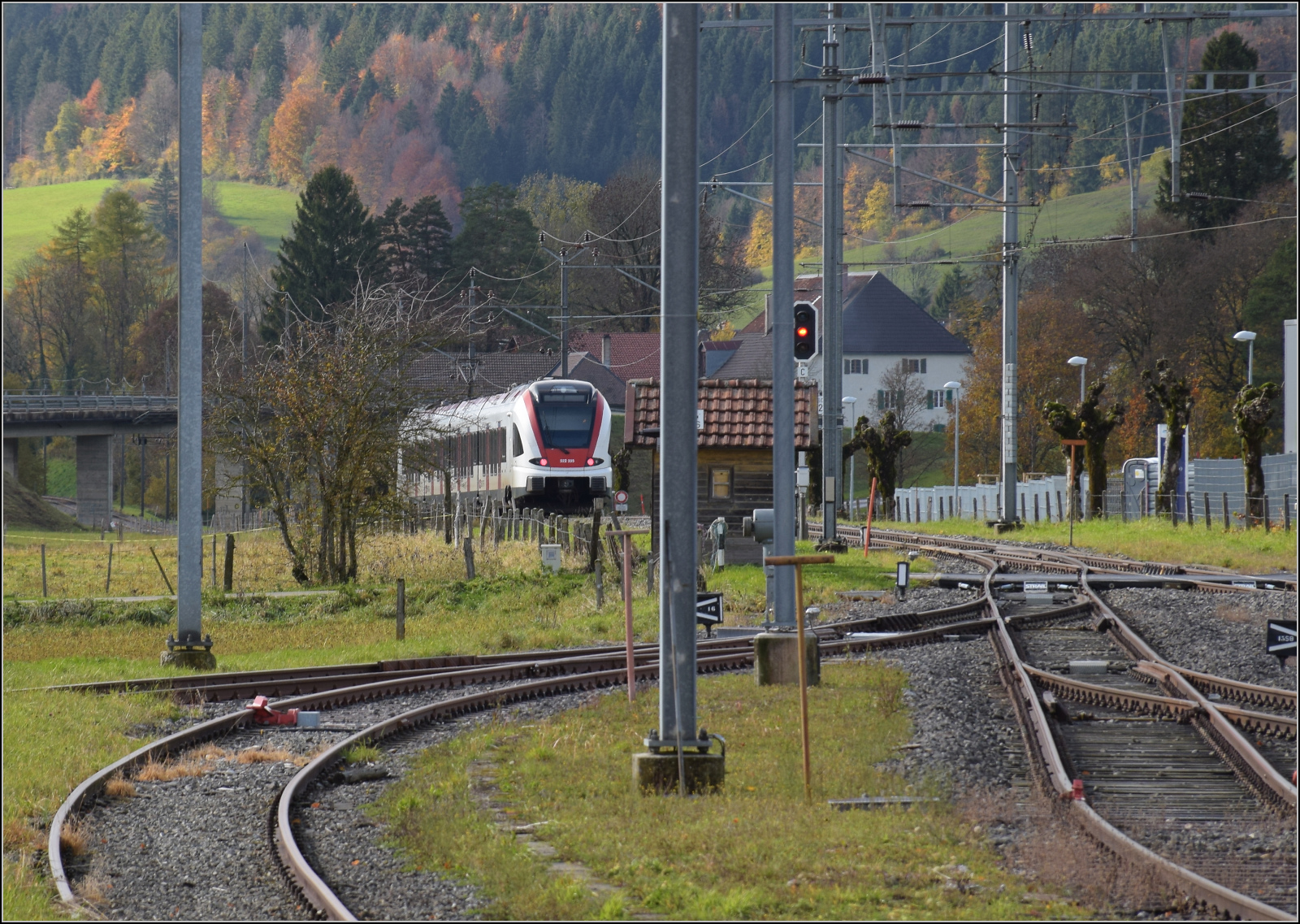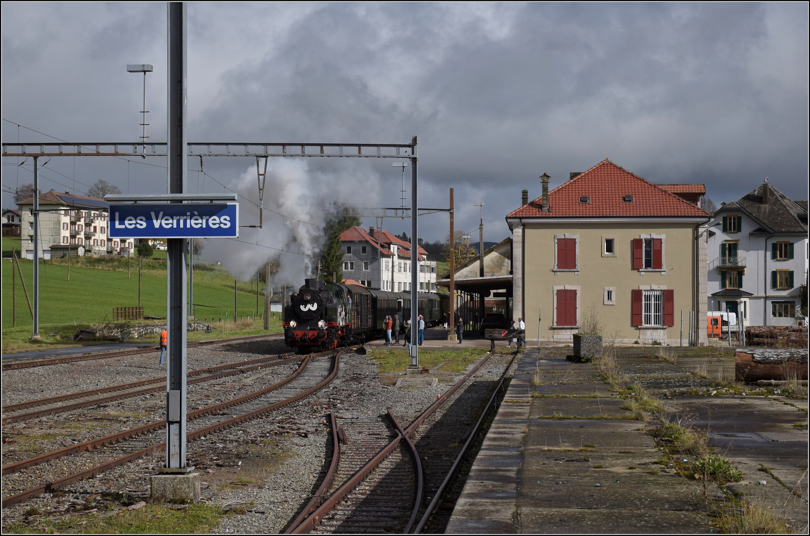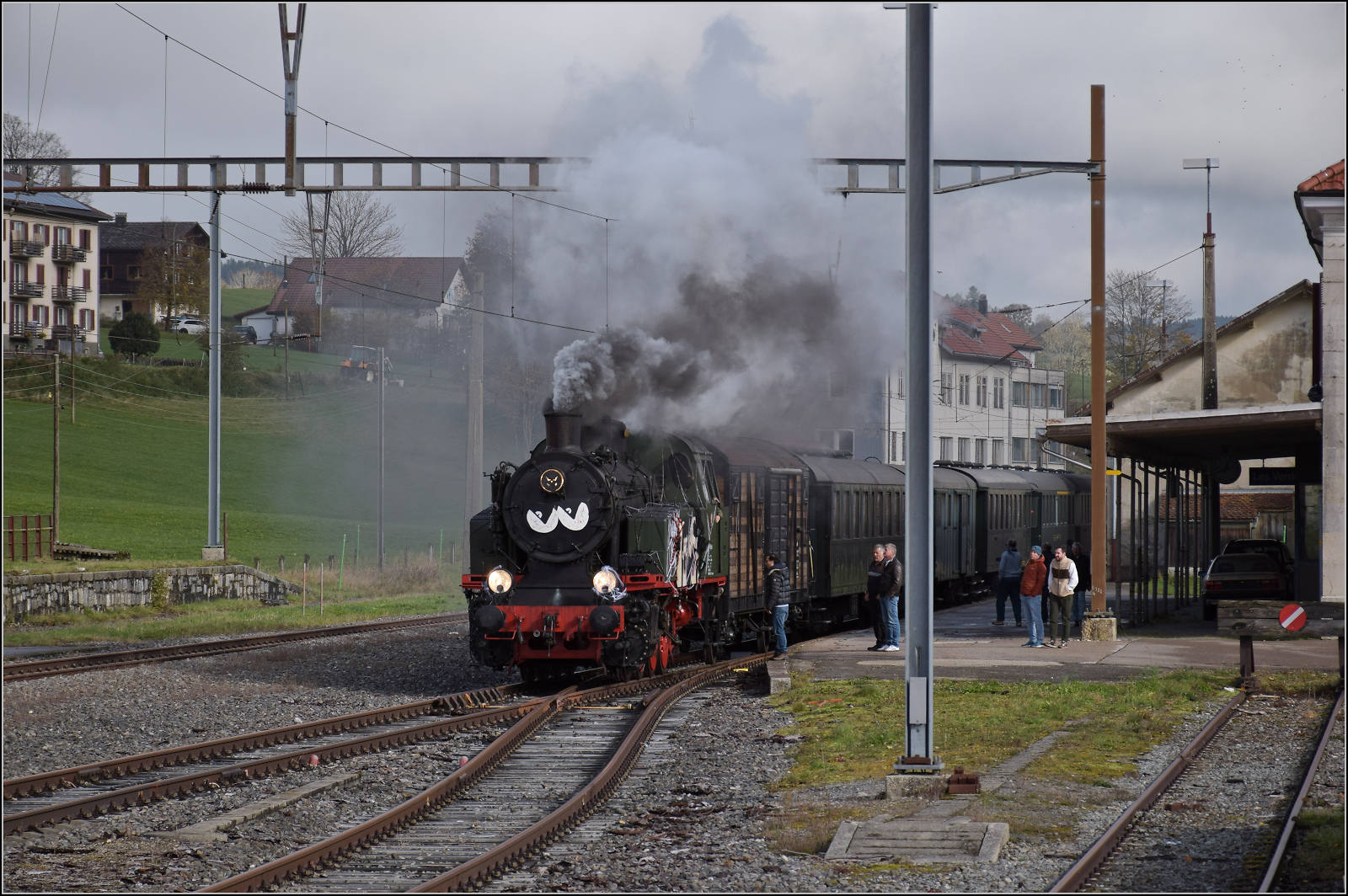 Gruseln zwischen Asphalt und Absinth. Der Regelzug mit RABe 522 205 von Neuchâtel nach Pontarlier fährt in Les Verrières vorbei. Oktober 2025.