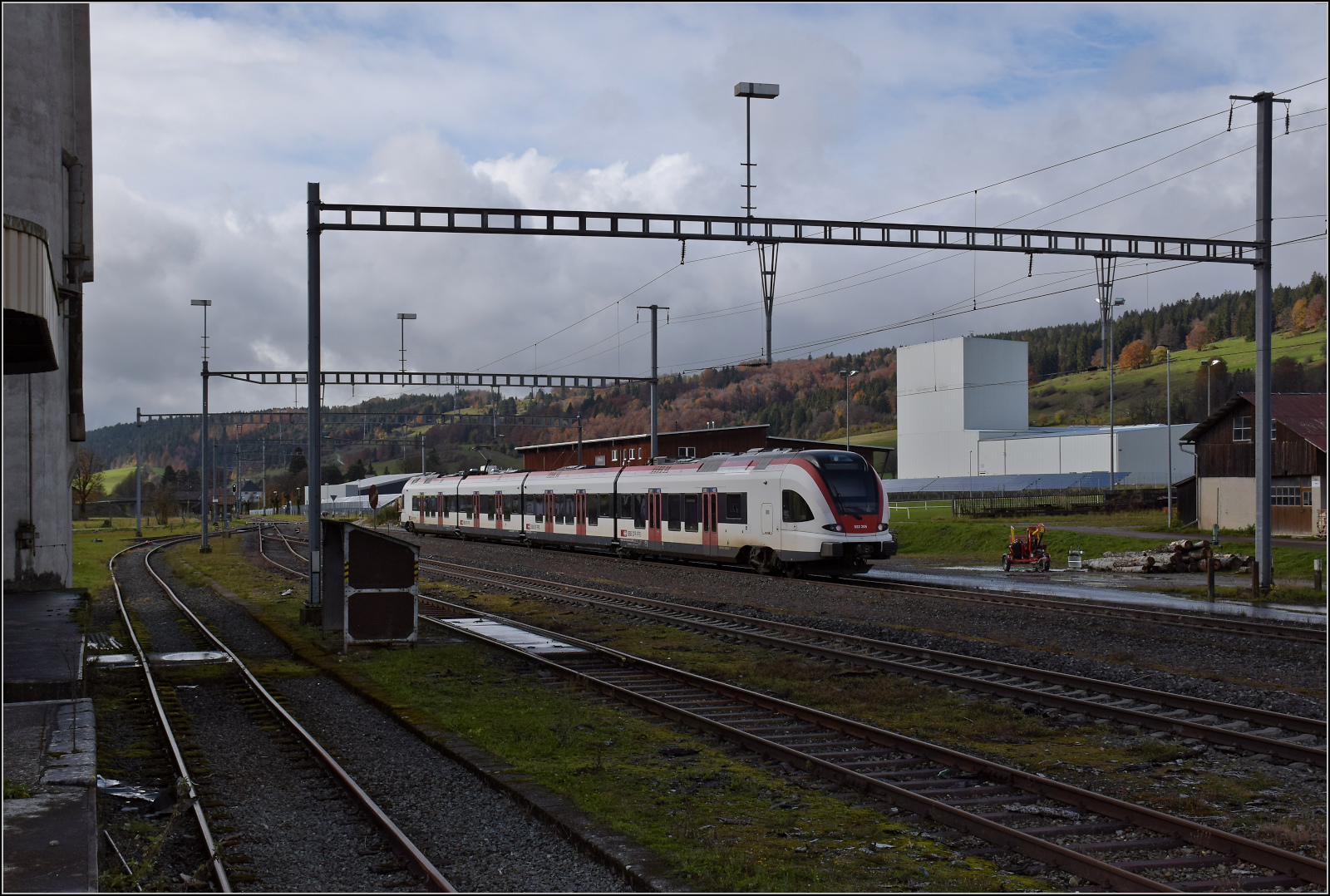 Der Regelzug mit RABe 522 205 von Neuchâtel nach Pontarlier fährt in Les Verrières vorbei. Oktober 2025.