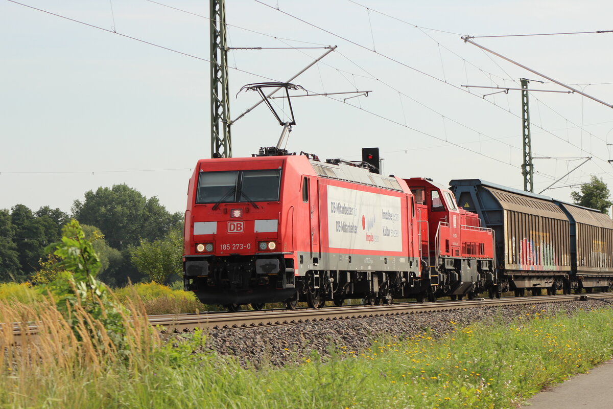 BR 185 273-0 D-DB + BR 265 003-4 D-DB mit einem Mischer bei der Durchfahrt Weddel (b.Braunschweig) Richtung Braunschweig. 9.August 2025 Dominik Klöpfer