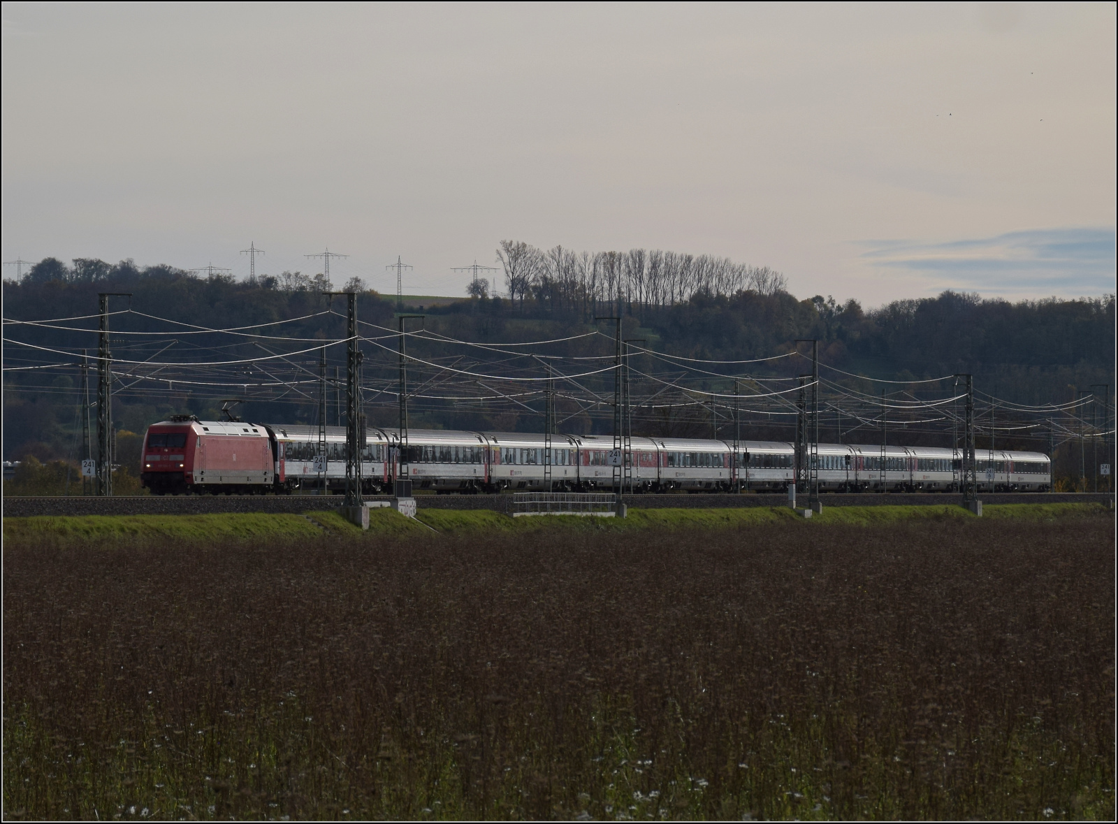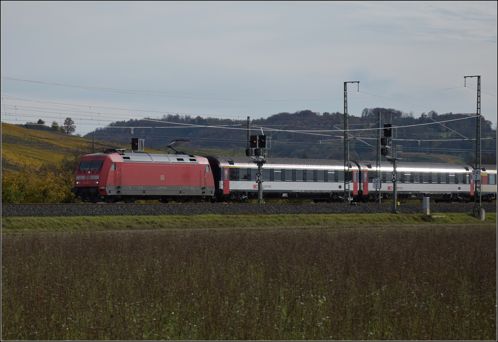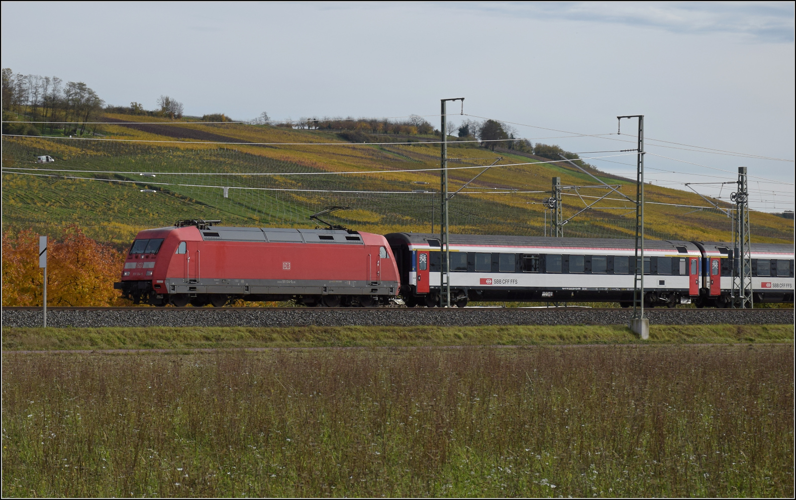 101 134 mit dem EC 6 auf dem Weg nach Dortmund. Im Bild ist der ganze Zug mit den Schweizer Eurocitywagen von hinten betrachtet. Ein echter Zugschluss ist bei Personenzügen heute fast nicht mehr zu beobachten. Oktober 2025. km0