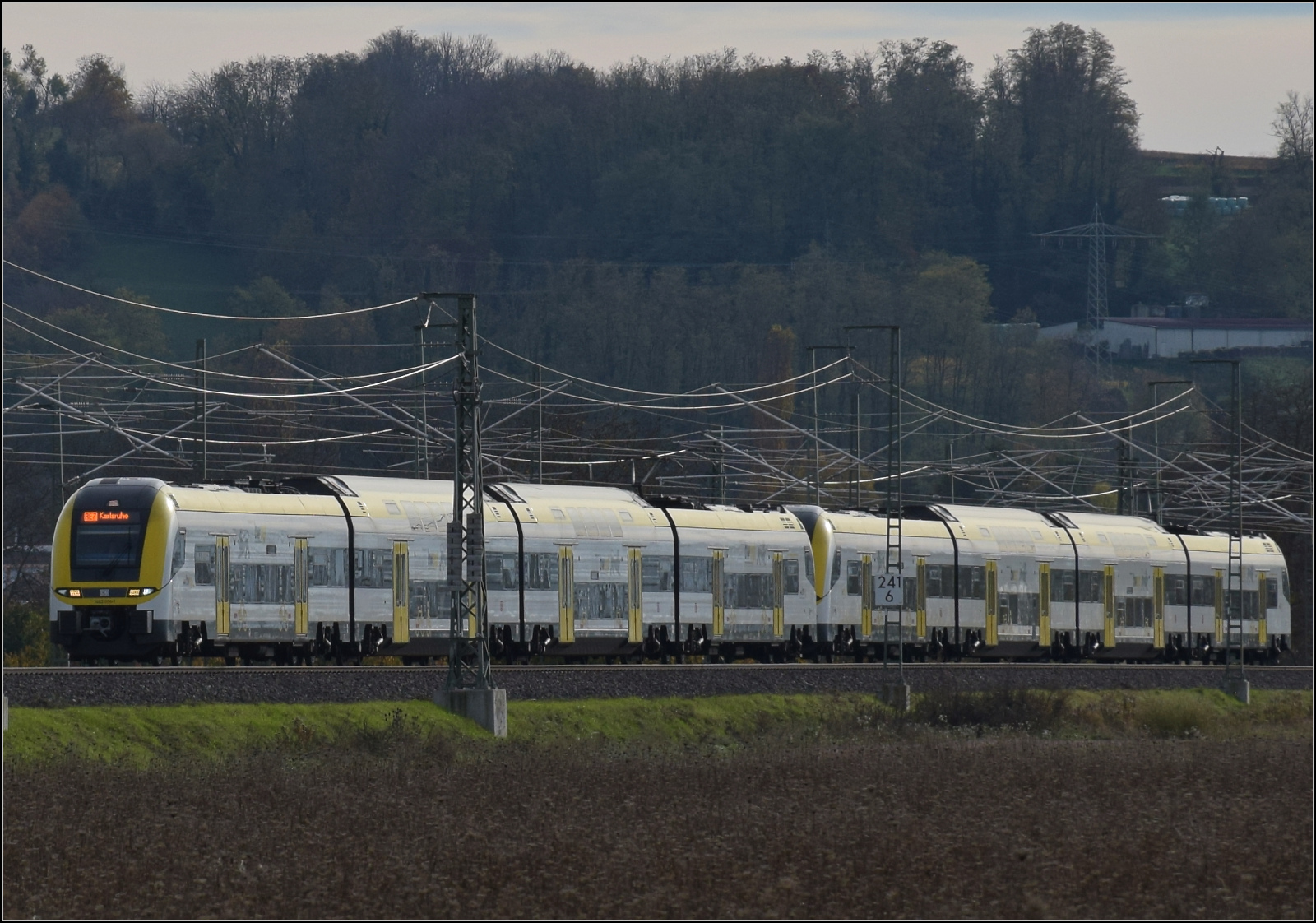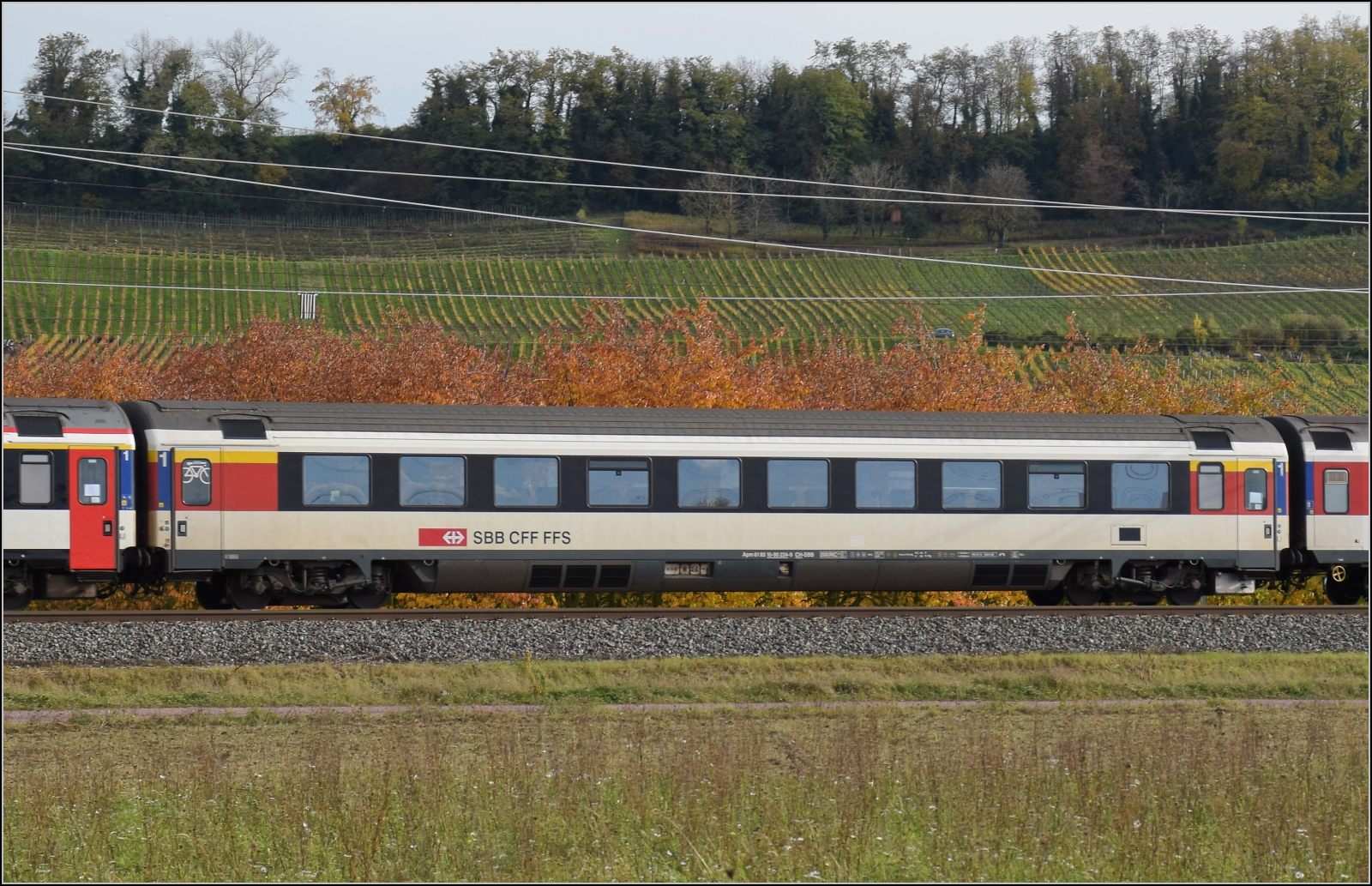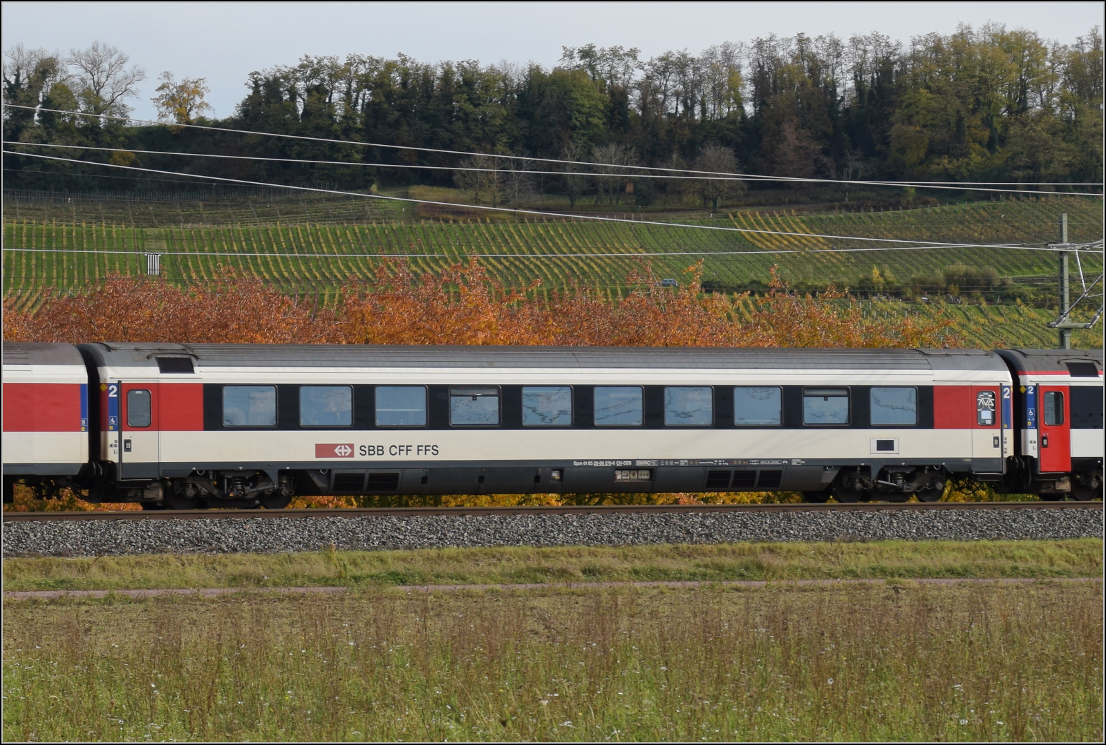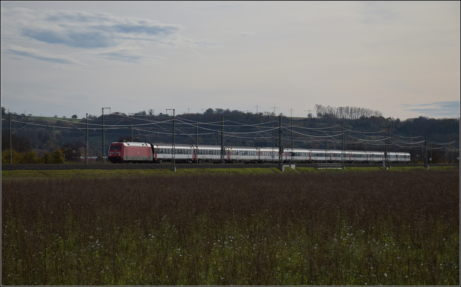 101 134 mit dem EC 6 auf dem Weg nach Dortmund. Im Bild ist der ganze Zug mit den Schweizer Eurocitywagen von hinten betrachtet. Ein echter Zugschluss ist bei Personenzügen heute fast nicht mehr zu beobachten. Oktober 2025. km0