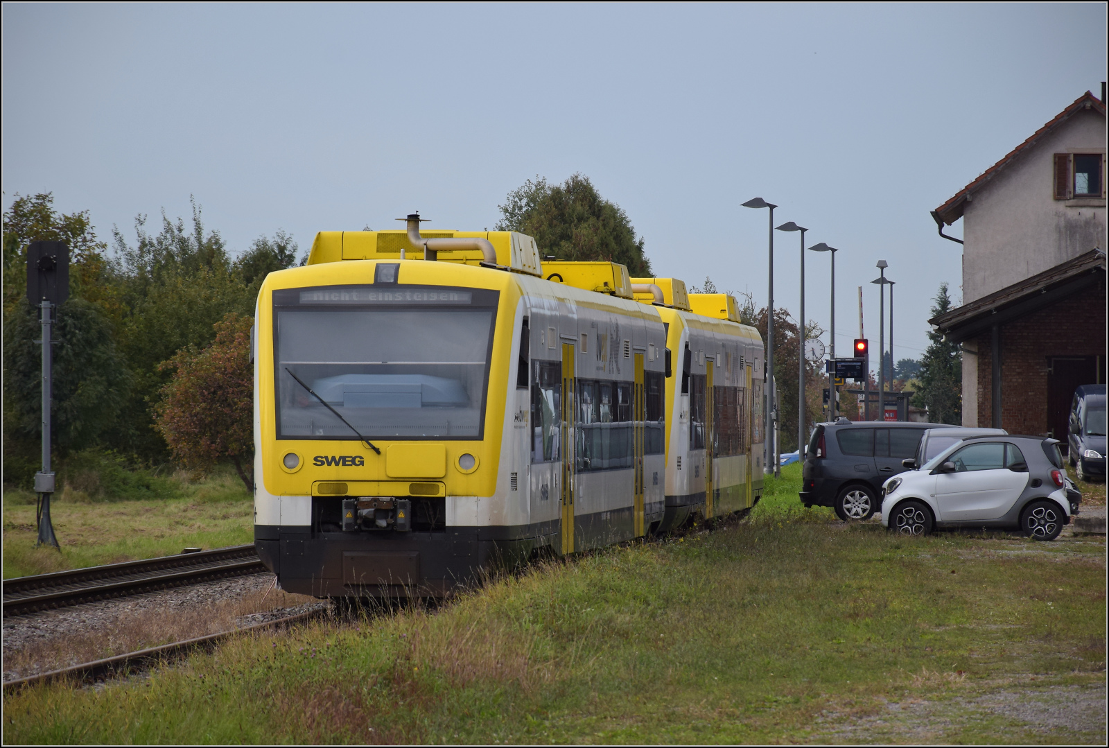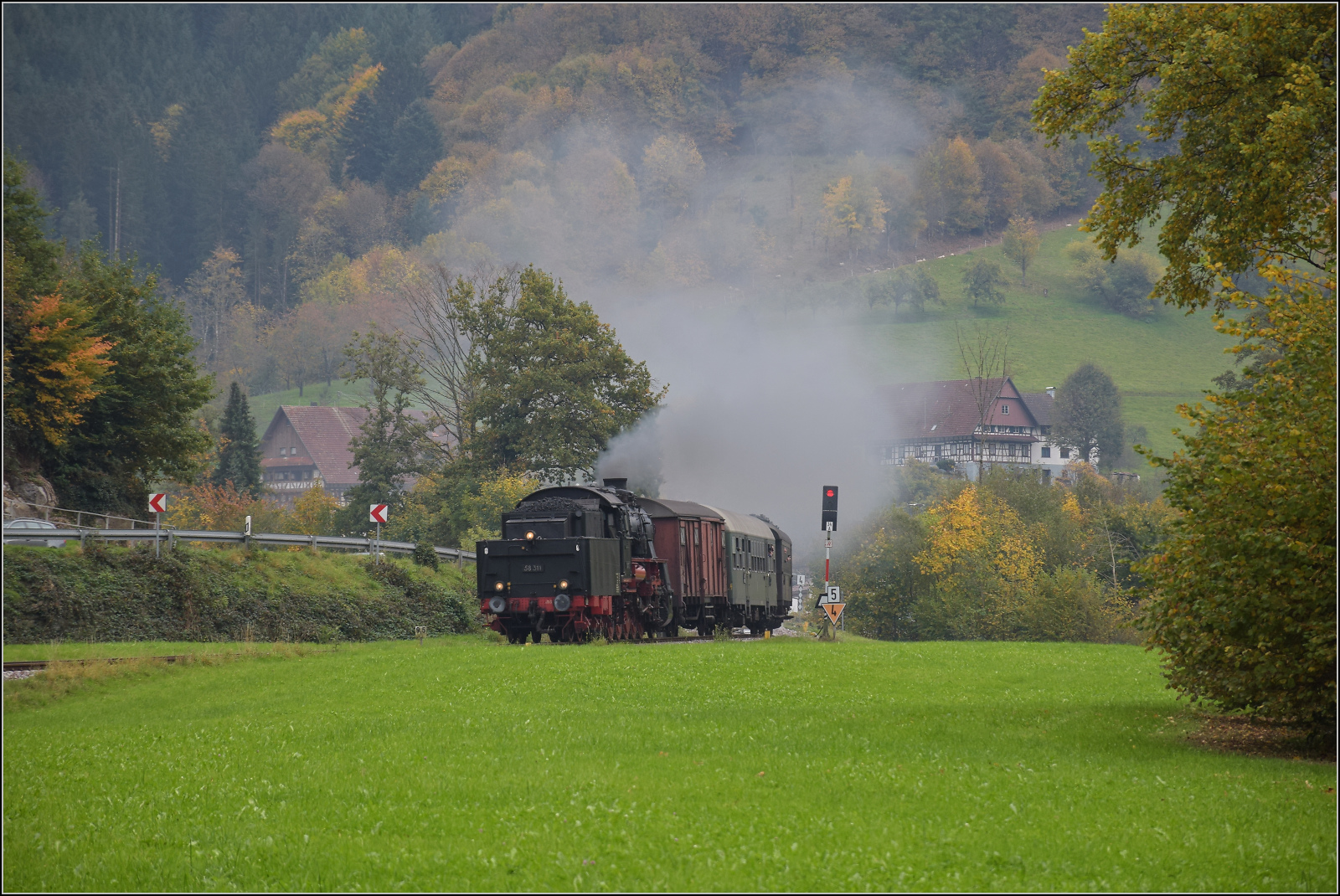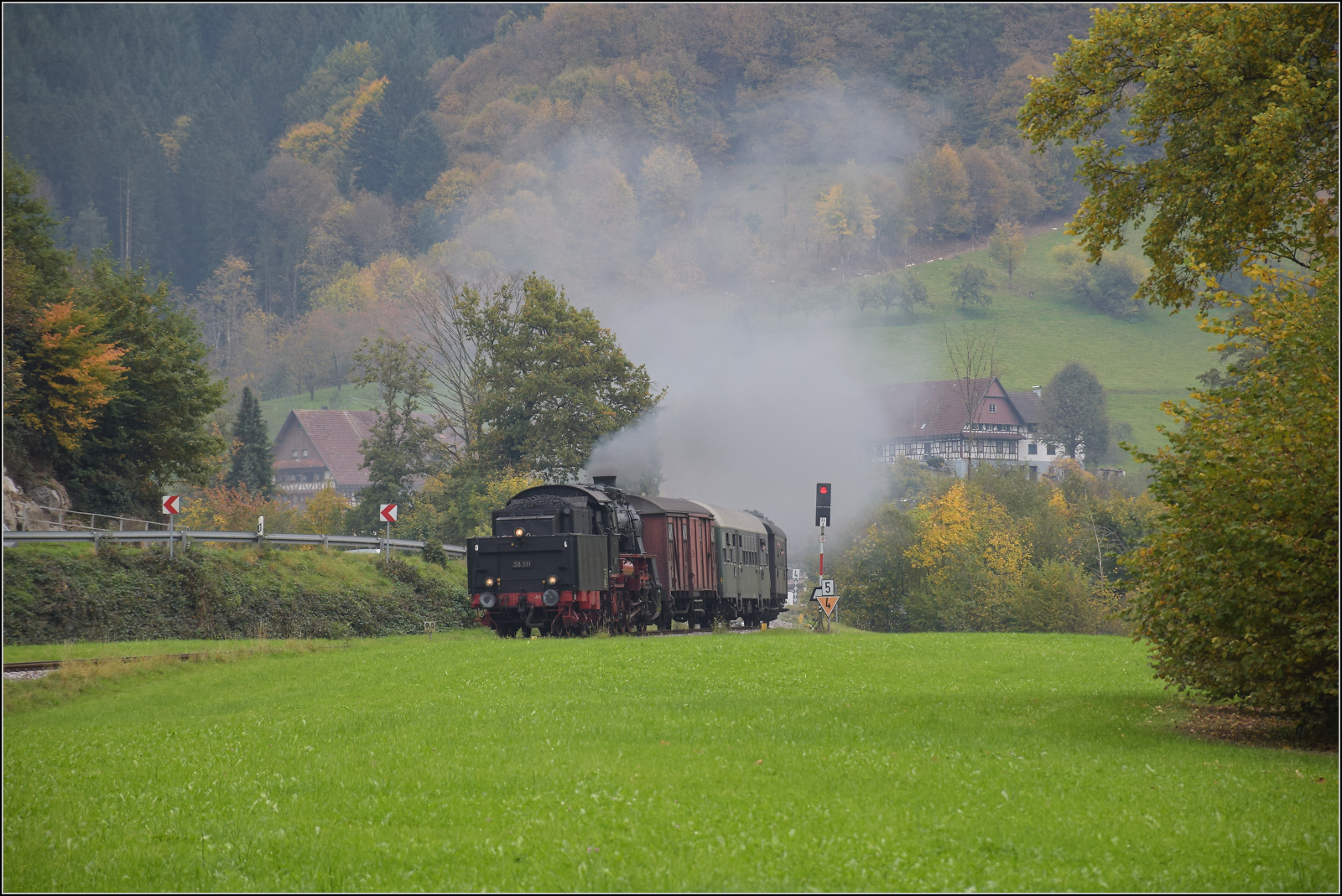 Kurzstrecke in Kappelrodeck, 58 311 auf dem Weg vom Haltepunkt im Osten des Dorfs zum Bahnhof, wo ein längerer Halt zum Besuch der Winzer-Kirwi eingeplant ist. Oktober 2025. km0
