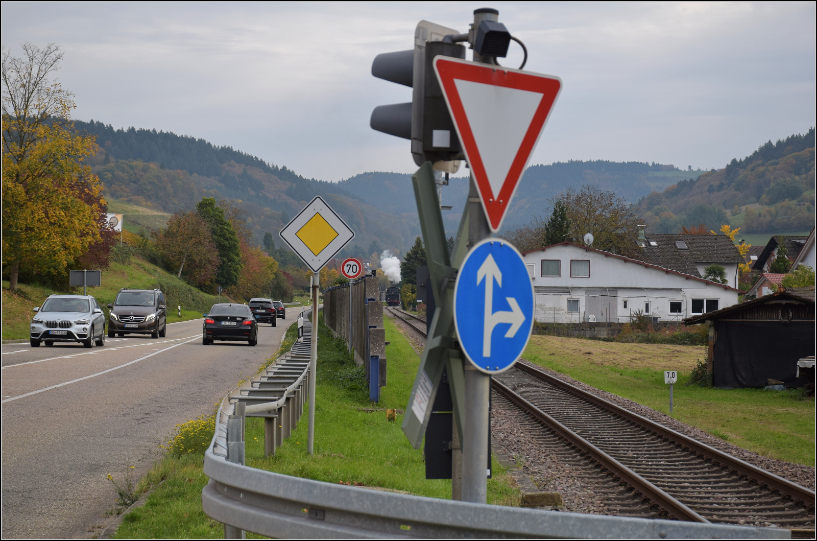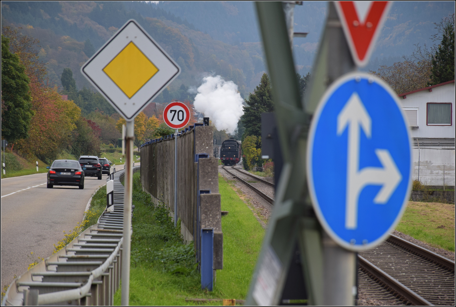 Abfahrt in Kappelrodeck Ost. Nur durch einen Spalt hinter der Lärmschutzwand kann man 58 311 bei der Beschleunigung beobachten. Immerhin, bei der SWEG ist die Vernunft eingekehrt, die Lärmschutzwand schützt die Anwohner vor dem Lärm der Umgehungsstrasse und nicht vor dem bisschen Bahn. Oktober 2025. km0