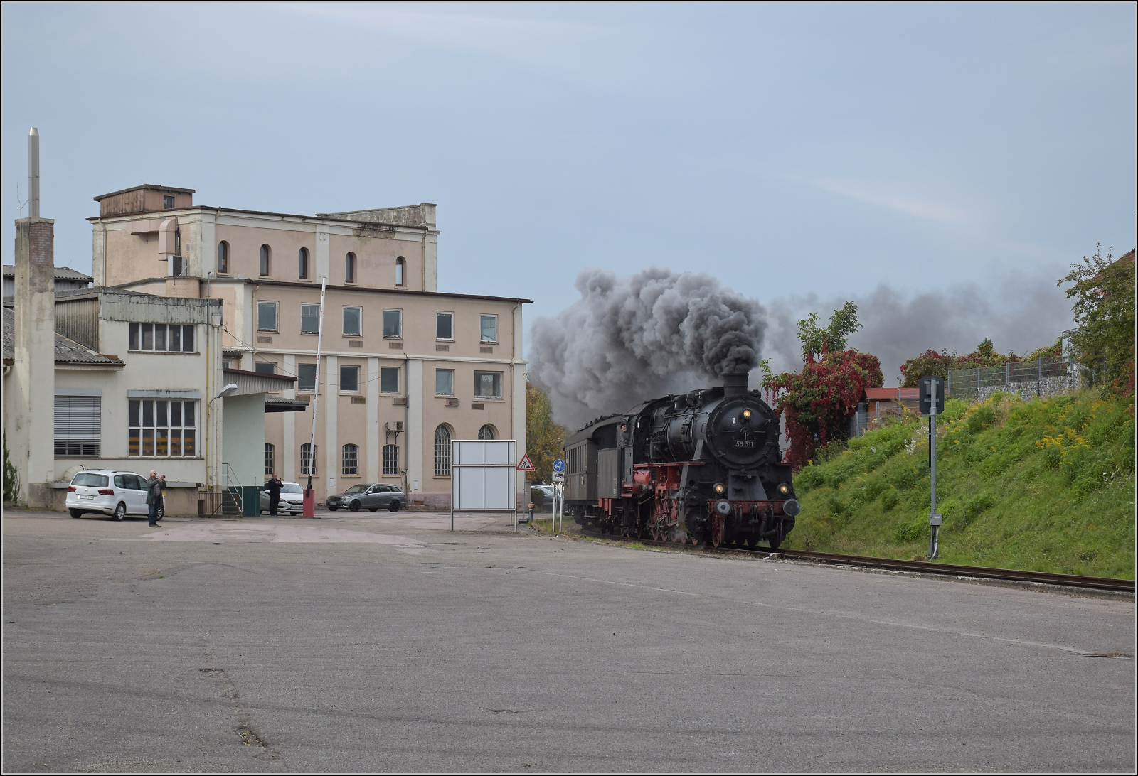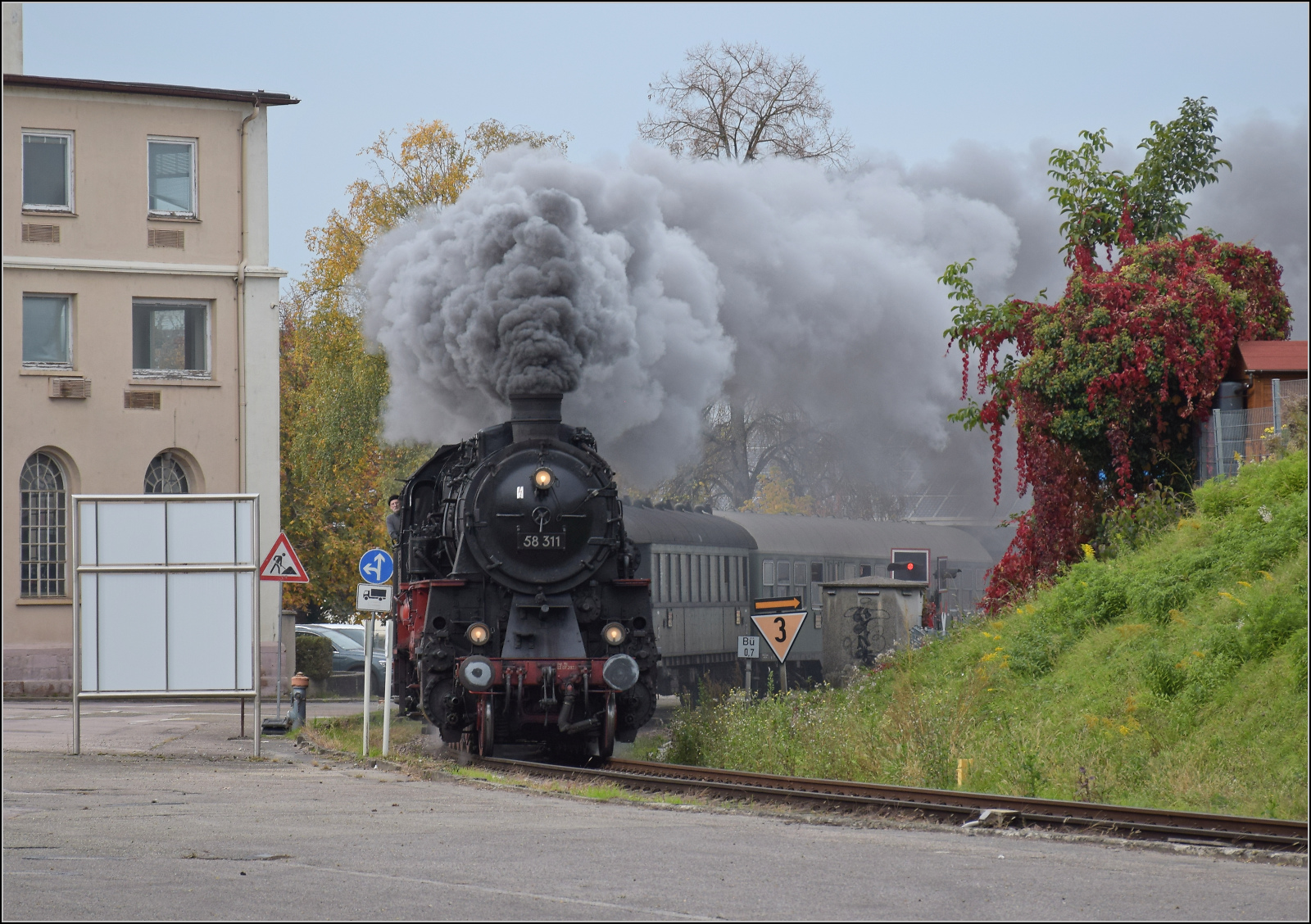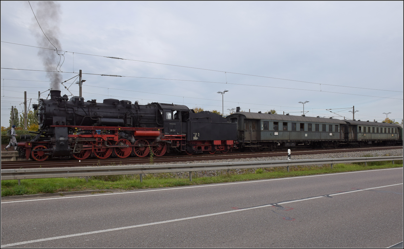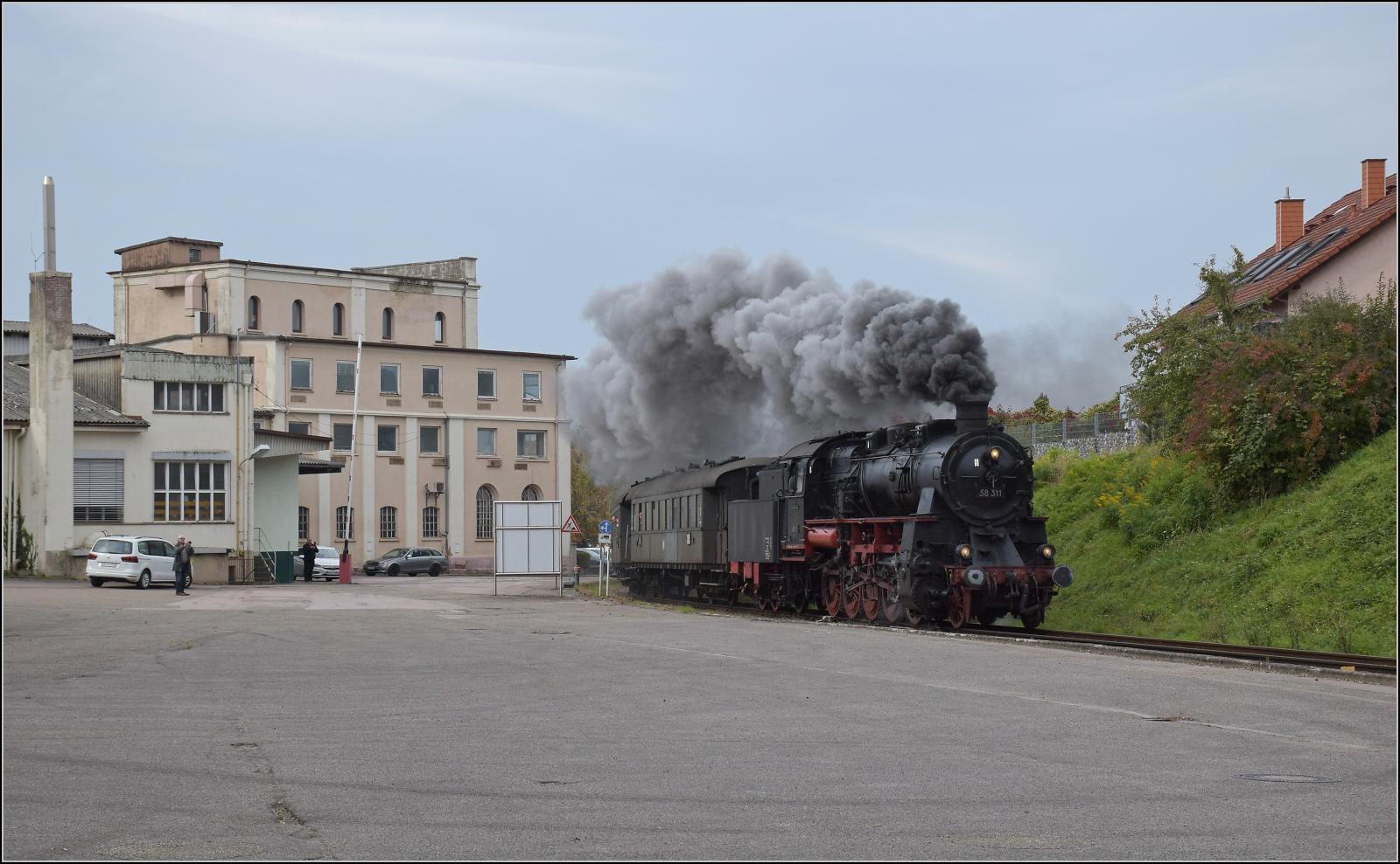 58 311 steht in Achern mit ihrem Sonderzug zur Fahrt auf die Achertalbahn bereit. Ziel ist der Unterwegshalt Kappelrodeck, wo auf der Rückfahrt ein längerer Halt zum Besuch der Winzer-Kirwi vorgesehen ist. Fotos gibt es aber nur von der Fahrt dorthin. Oktober 2025. km0