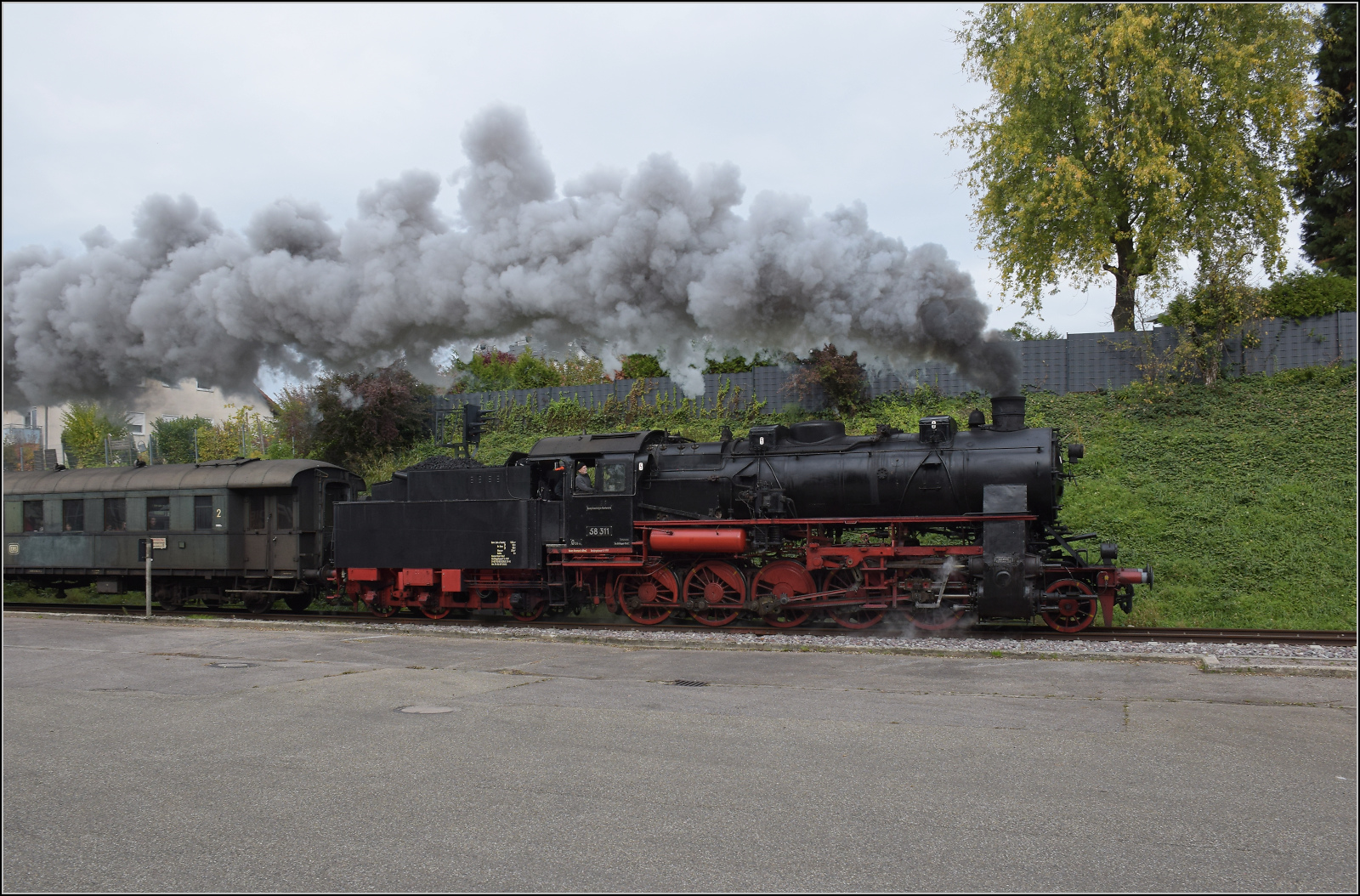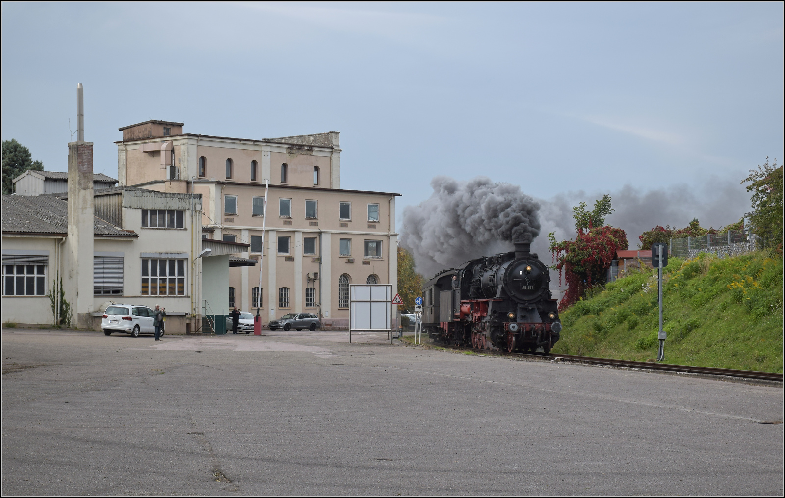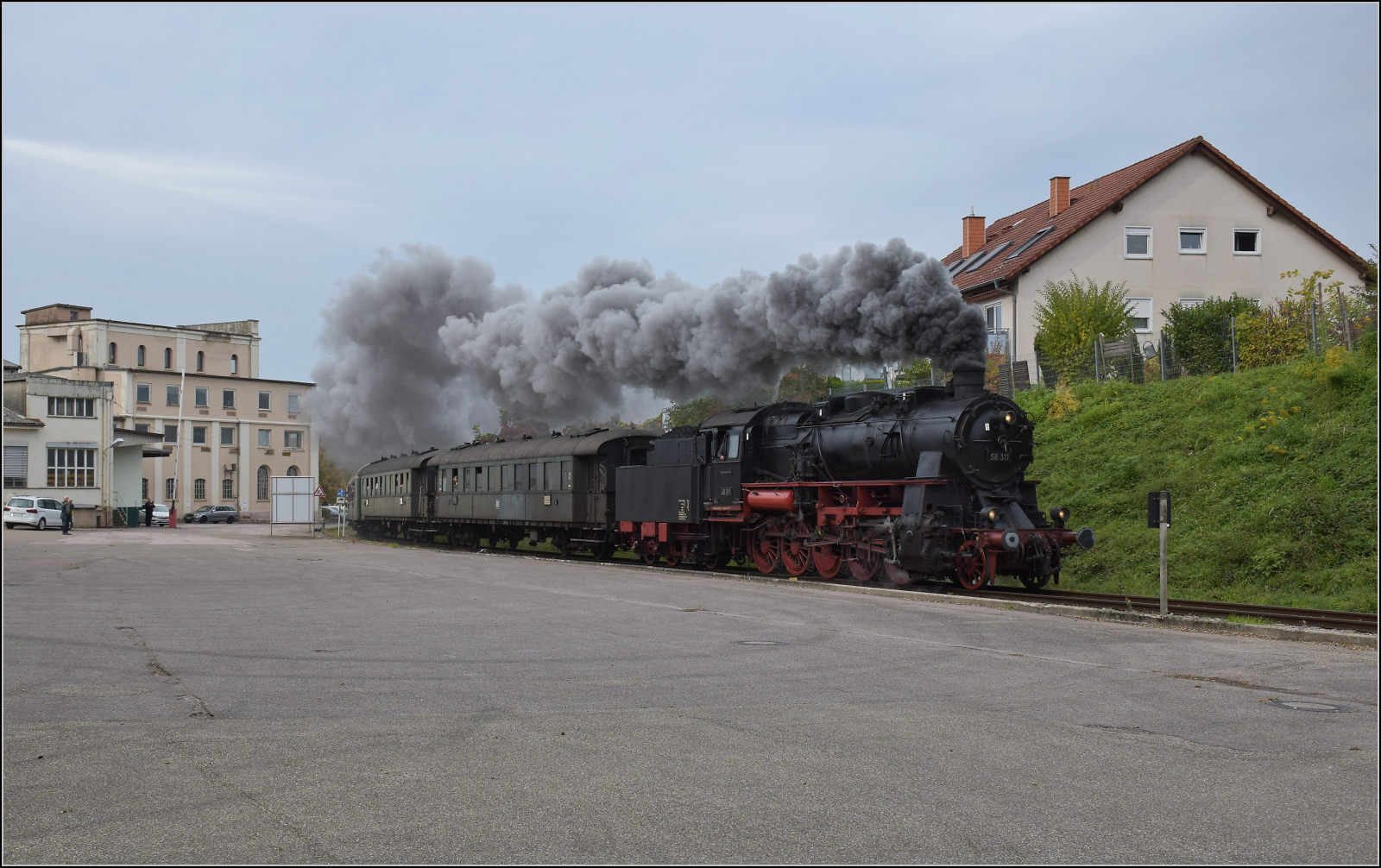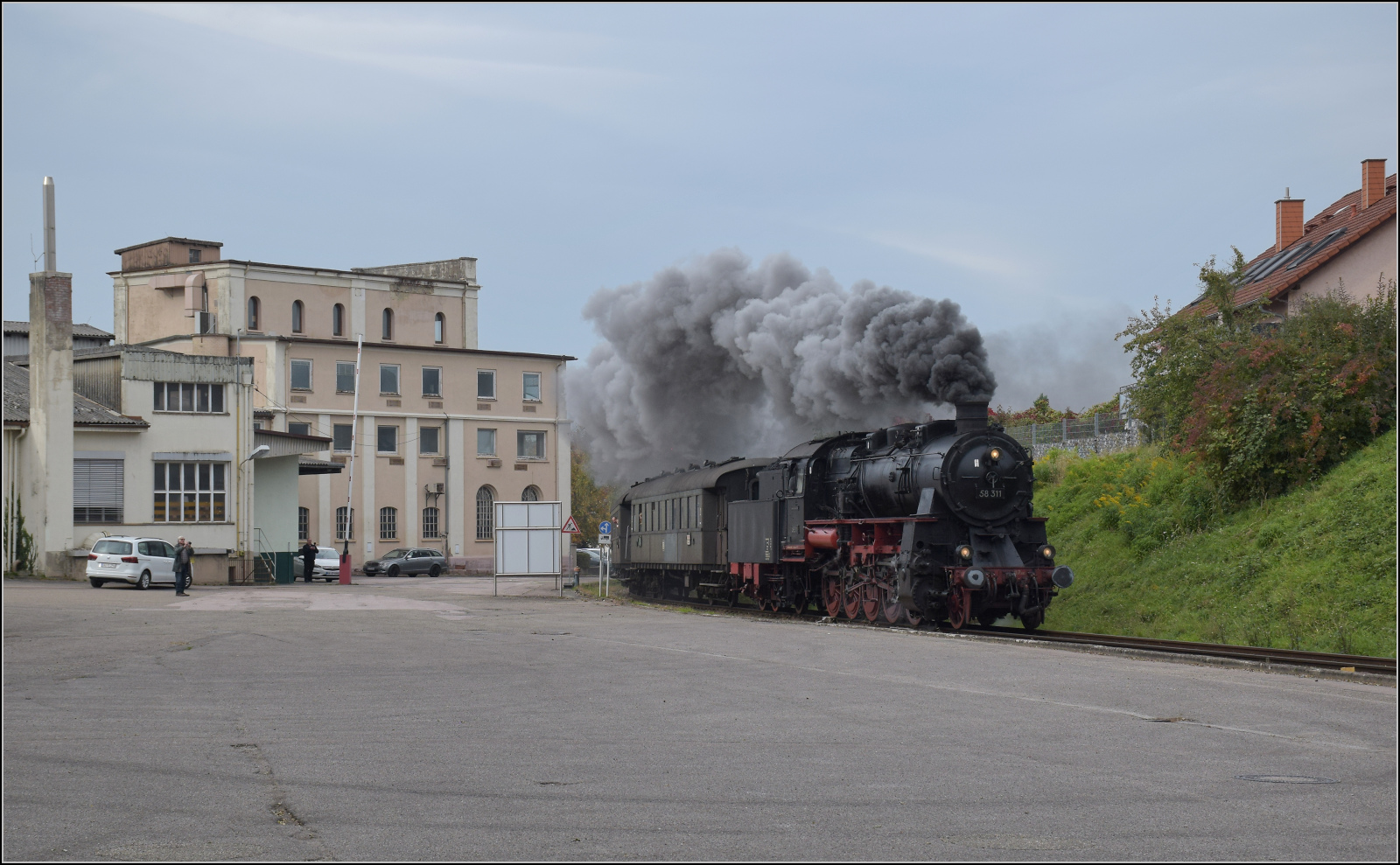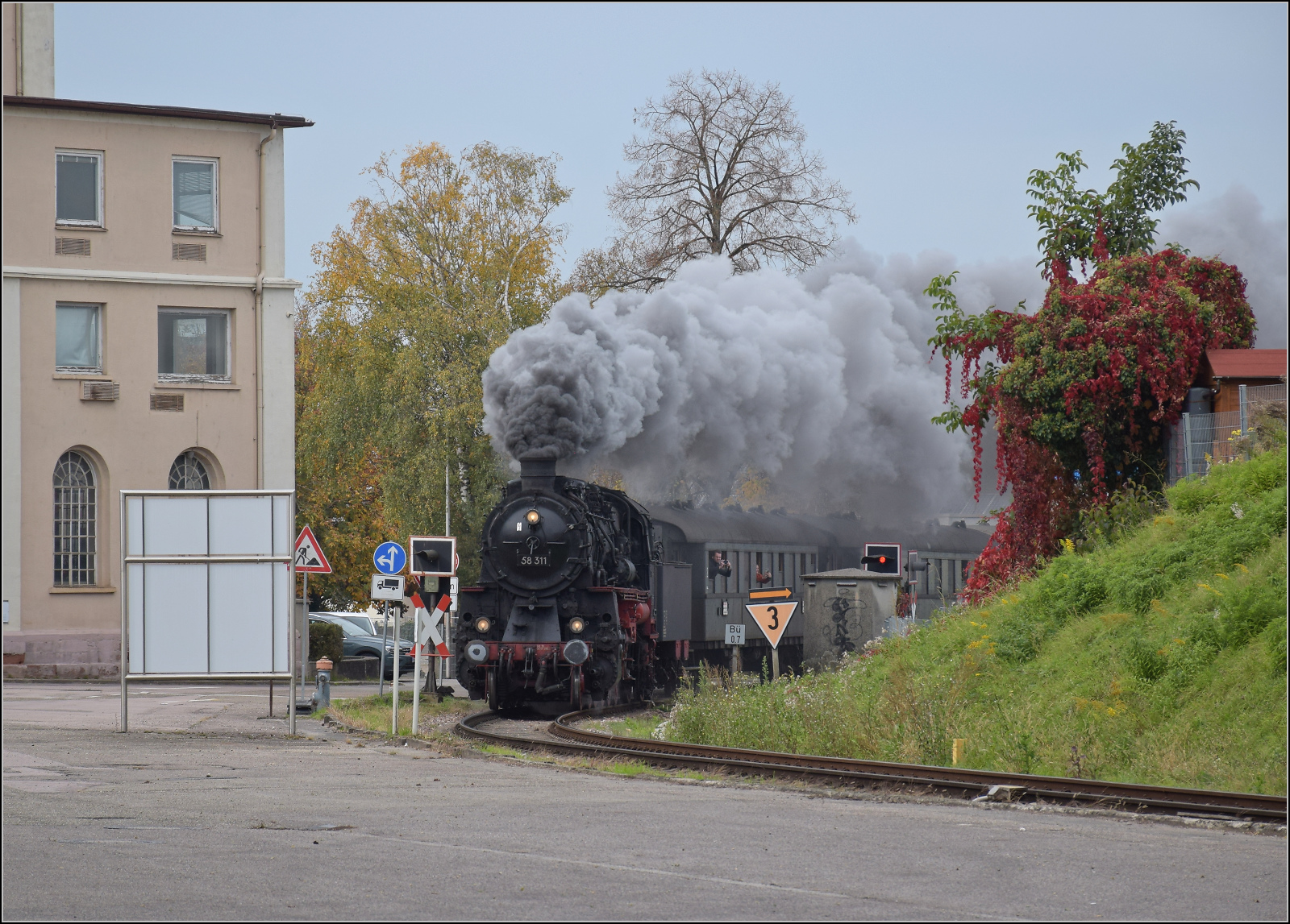 58 311 steht in Achern mit ihrem Sonderzug zur Fahrt auf die Achertalbahn bereit. Ziel ist der Unterwegshalt Kappelrodeck, wo auf der Rückfahrt ein längerer Halt zum Besuch der Winzer-Kirwi vorgesehen ist. Fotos gibt es aber nur von der Fahrt dorthin. Oktober 2025. km0