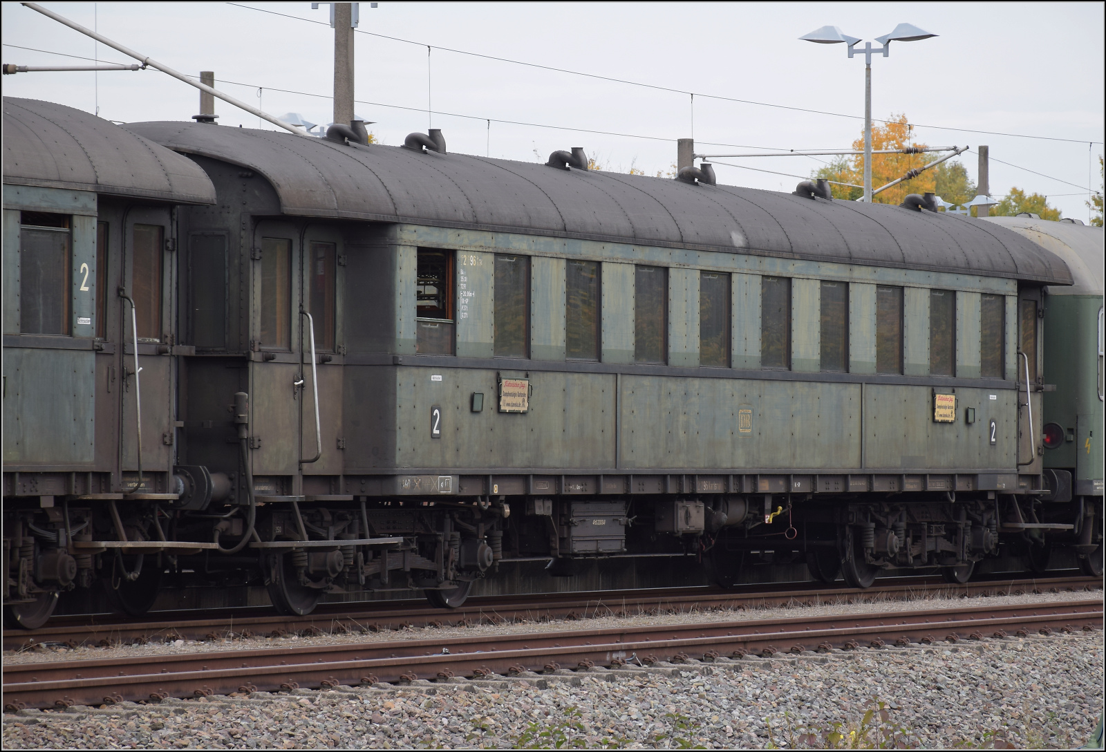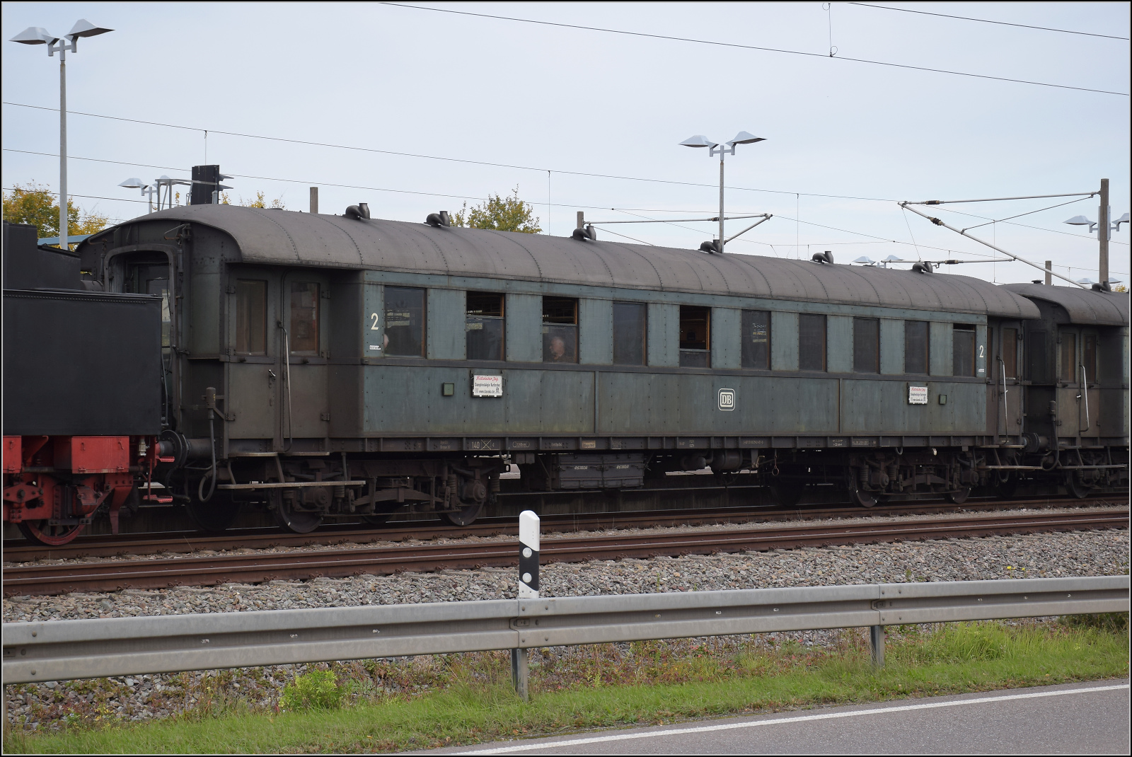 58 311 steht in Achern mit ihrem Sonderzug zur Fahrt auf die Achertalbahn bereit. Im Bild der Eilzugwagen 72 796 Karlsruhe. Oktober 2025. km0