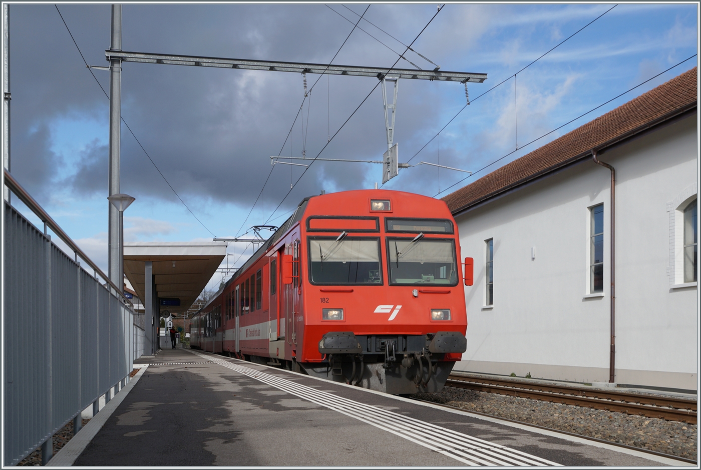In Bonfol wartet der CJ Regionalzug R51 auf die Abfahrt nach Porrentruy. Ab dem Fahrplanwechsel werden SBB Flirts (von Delémont durchgebunden) die Strecke der CJ bedienen und somit wird ein bisher willkommener "Farbtupfer" in der Bahnlandschaft verschwinden.