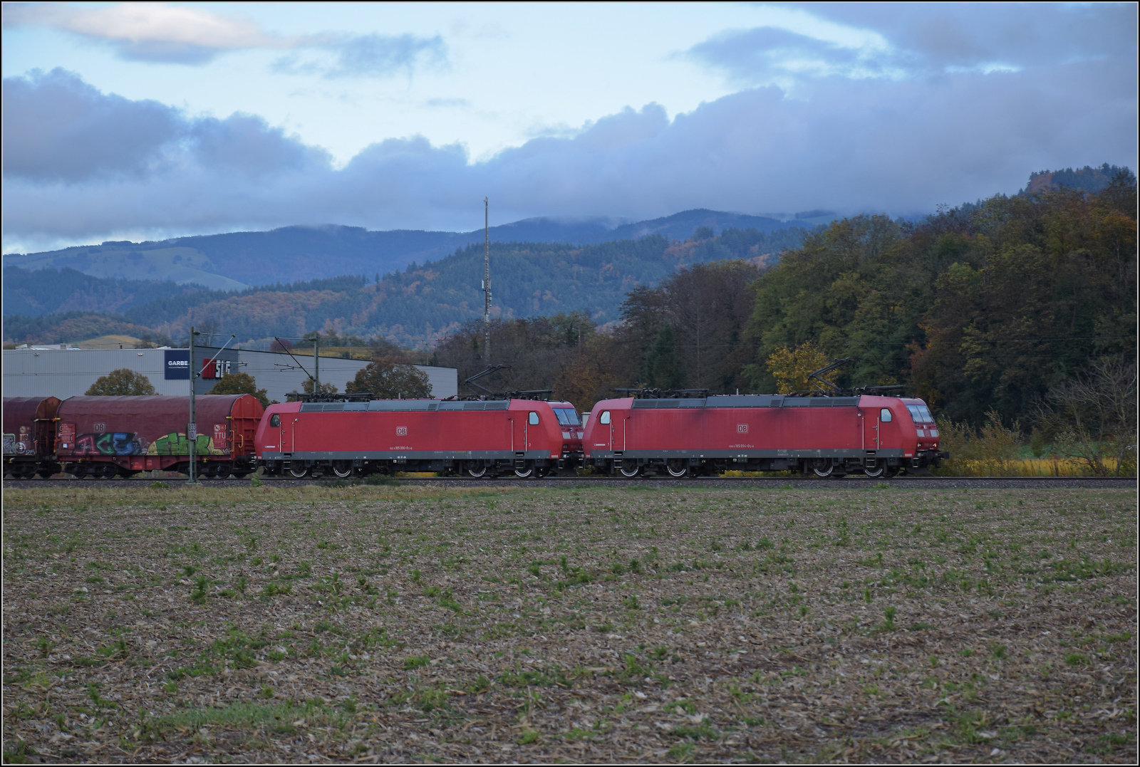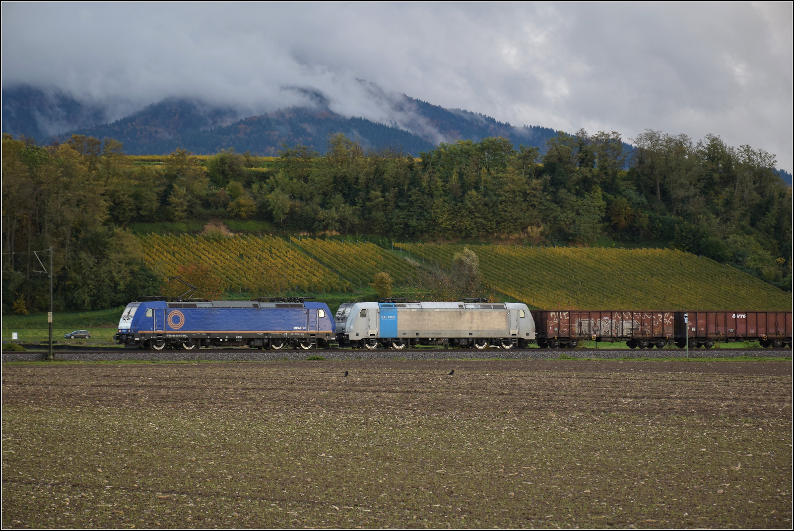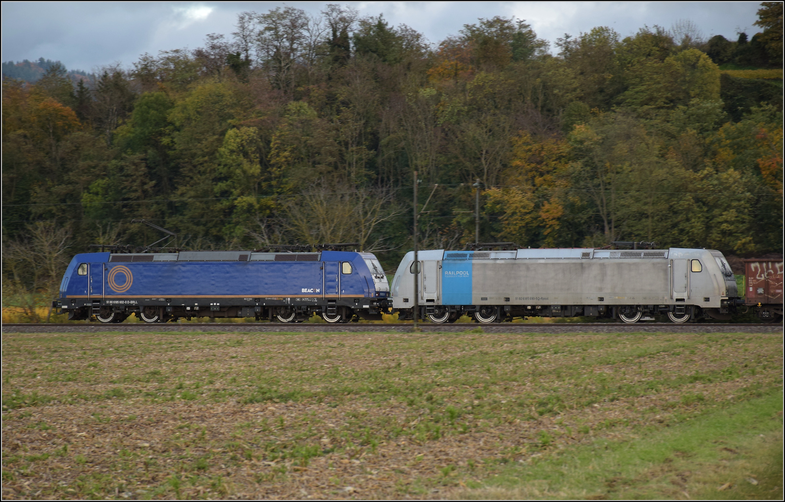 185 602 von Beacon und 185 690 von Railpool bei Buggingen zur Abholung neuer Rüben aus dem Norden. Oktober 2025.