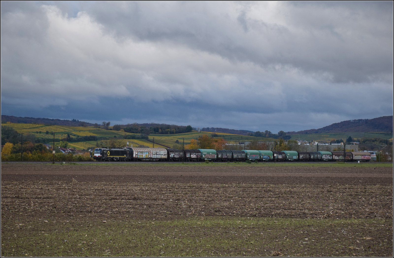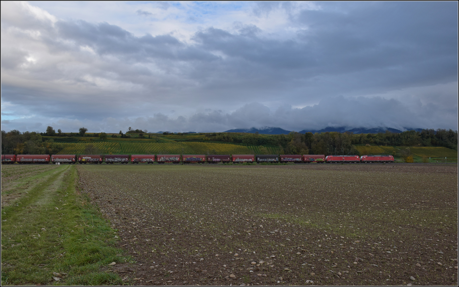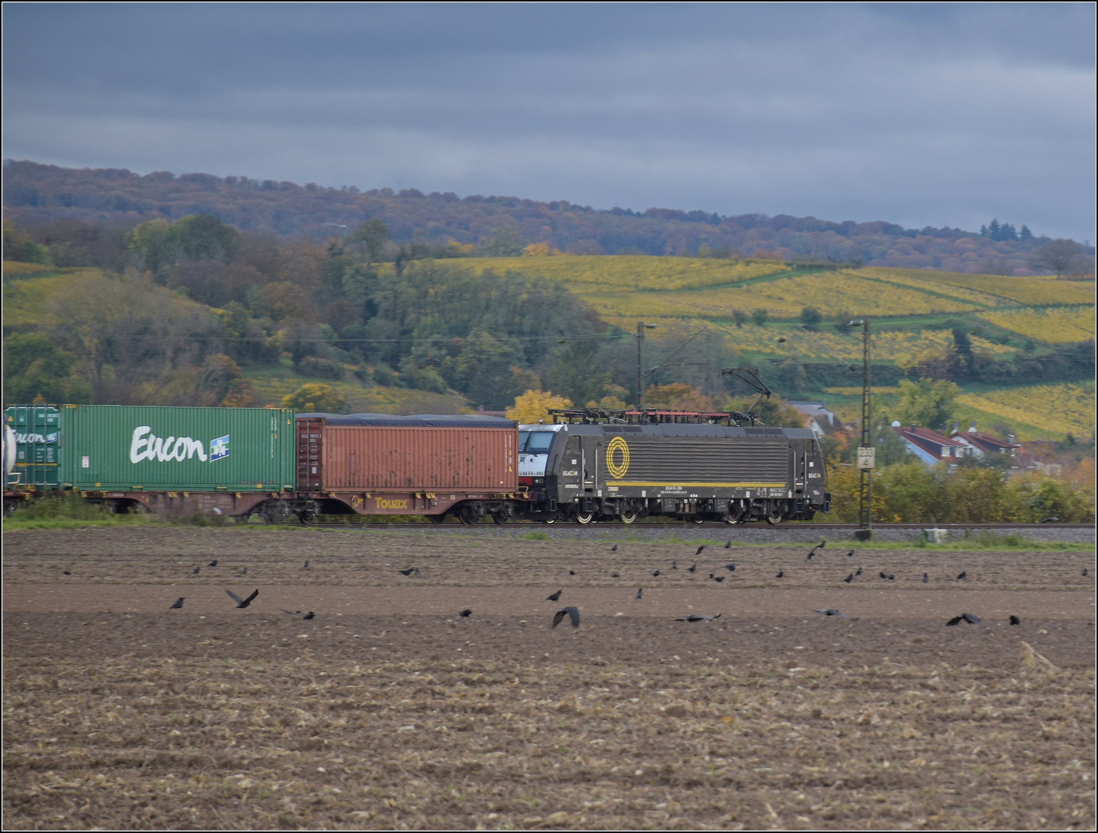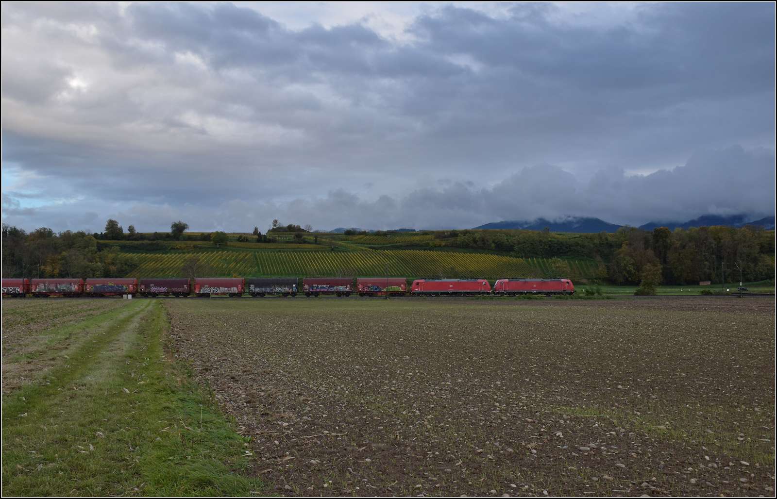 185 602 von Beacon und 185 690 von Railpool bei Buggingen zur Abholung neuer Rüben aus dem Norden. Oktober 2025.