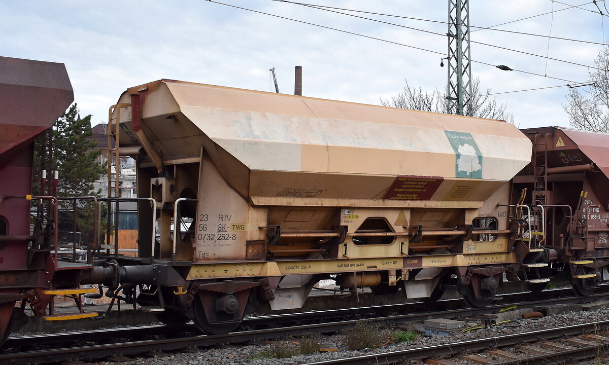 Schüttgutwagen mit dosierbarer Schwerkraftentladung und zwei Radsätzen in offener Ausführung ohne Schwenkdach zum Schottertransport vom Einsteller TANKWAGON Sp z o.o. mit slowakischer Registrierung mit der Nr. 23 RIV 56 SK-TWG 0732 252-8 Tds in einem Schotterzug am 03.12.25 Höhe Bahnhof Magdeburg Neustadt. Lothar Stöckmann