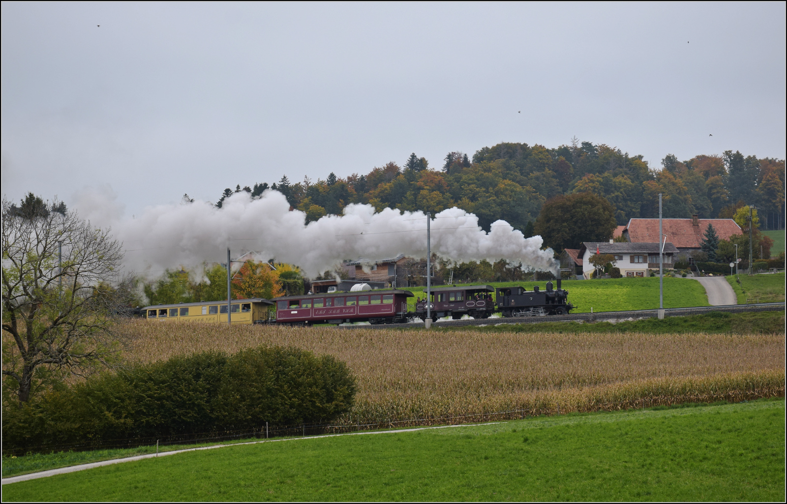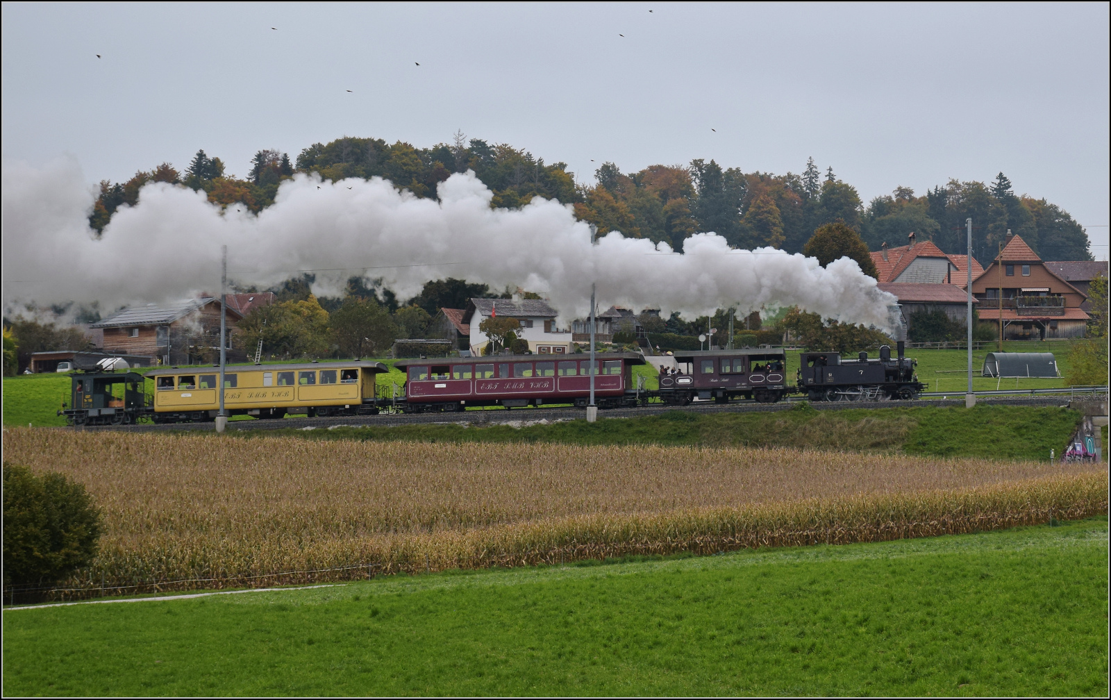 BSB Ed 3/4 51 auf ihrer Heimstrecke, bevor sie wegen ETCS ein Hausverbot bekommt. Steinhaus, Oktober 2025. km0