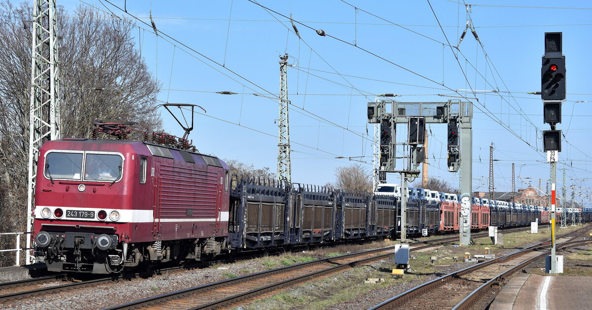 DeltaRail GmbH, Frankfurt (Oder) mit ihrer "243 179-9" (NVR: "91 80 6143 179-0 D-DELTA") und einem Nutzfahrzeug-Transportzug (fabrikneue VW Transporter aus polnischer Produktion) am 03.03.26 Höhe Bahnhof Magdeburg-Neustadt. Lothar Stöckmann