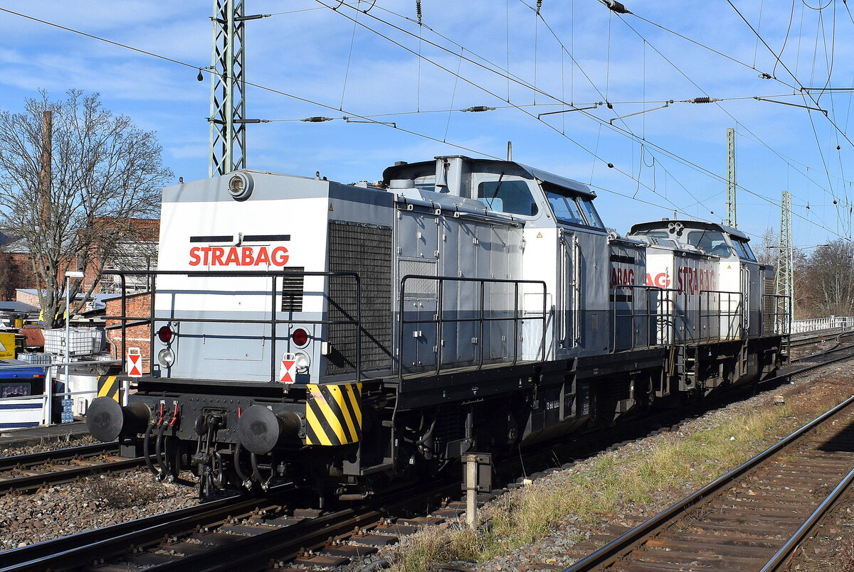 STRABAG BMTI Rail Service GmbH mit ihre beiden V 100 Loks "203 841-2" [NVR-Nummer: 92 80 1203 841-2 D-BRS] mit "203 012-0" [NVR-Nummer: 92 80 1203 012-0 D-BRS] am Haken am 03.03.26 Höhe Bahnhof Magdeburg-Neustadt. Lothar Stöckmann