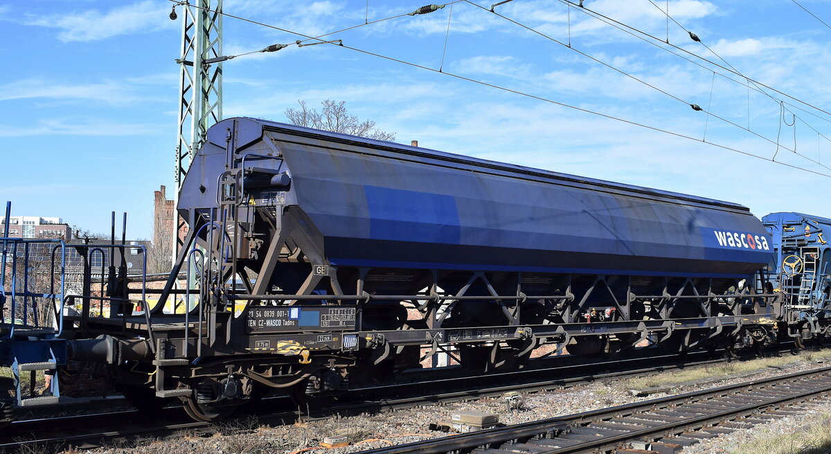 Vierachsiger Schüttgutwagen für den Transport von nässeempfindlichen Schüttgütern vom Einsteller vom Einsteller WASCOSA AG mit tschechischer Registrierung mit der Nr. 33 TEN 54 CZ-WASCO 0839 001-1 Tadns in einem Ganzzug am 03.03.26 Höhe Bahnhof Magdeburg-Neustadt. Lothar Stöckmann