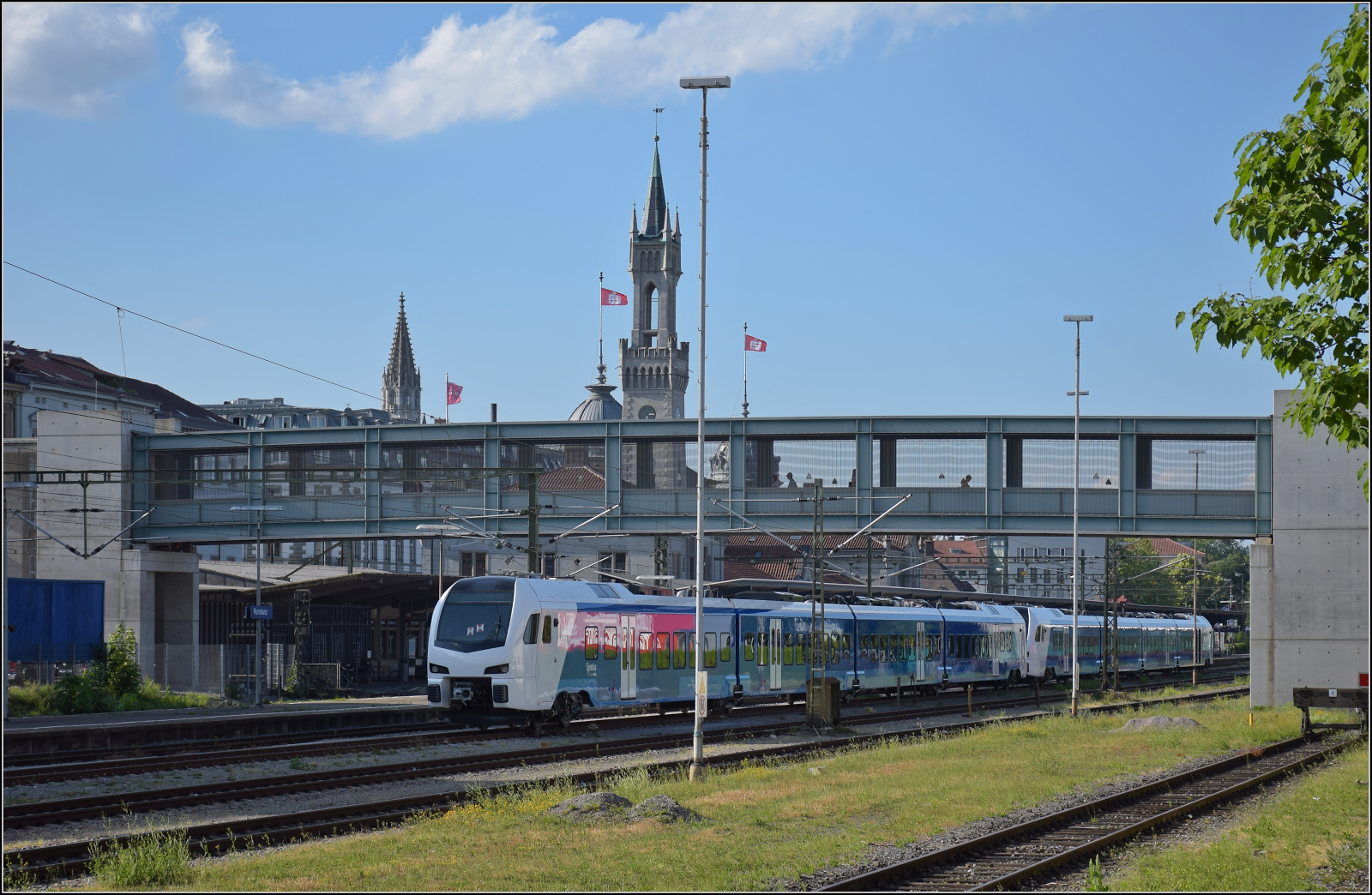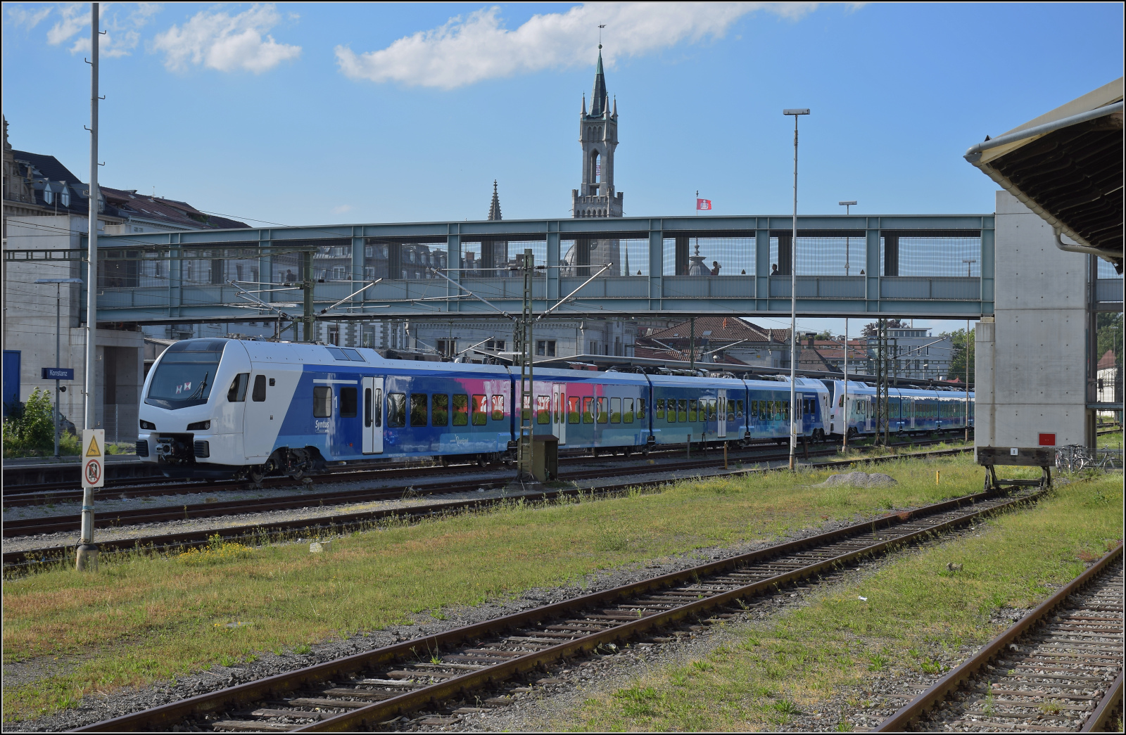 Im Juni 2017 gab es in Konstanz gleich zwei nette Fahrzeuge zu bewundern. Eines ist der Flirt 3 für Syntus - heute Keolis, der zu Zulassungsfahrten in die Niederlande überstellt wird. Die Fahrzeugnummern sind 7401 und 7402. Die NVR-Nummern der Endwagen sind 94 84 522 7401-4 NL-SYN und 94 84 521 7401-6 NL-SYN am vorderen Triebzug im Bild.