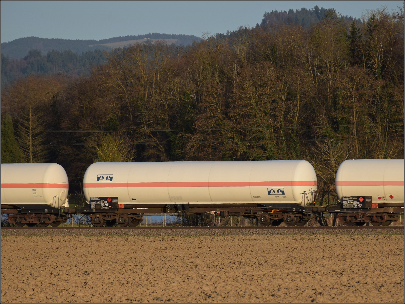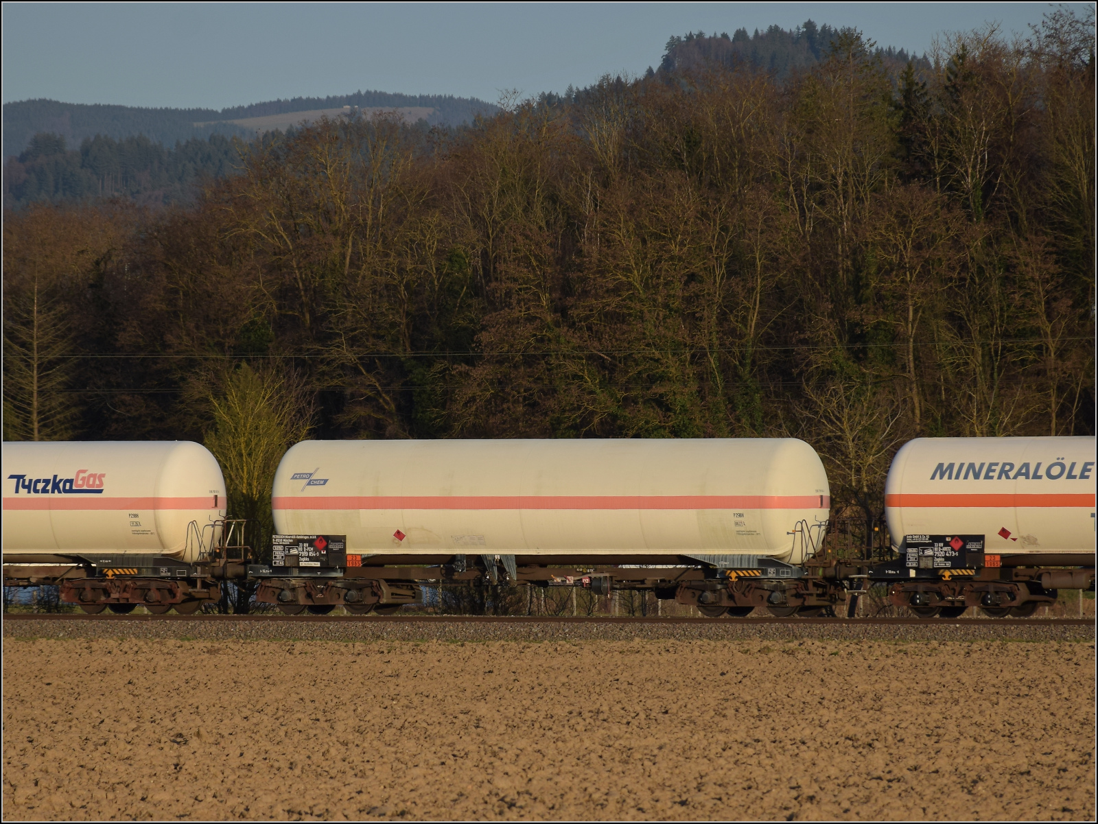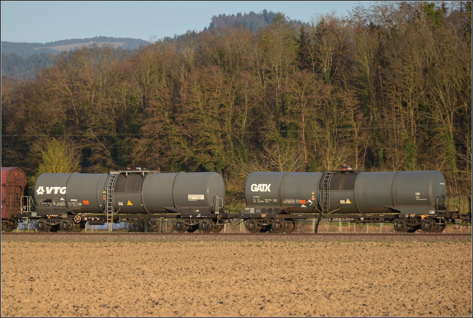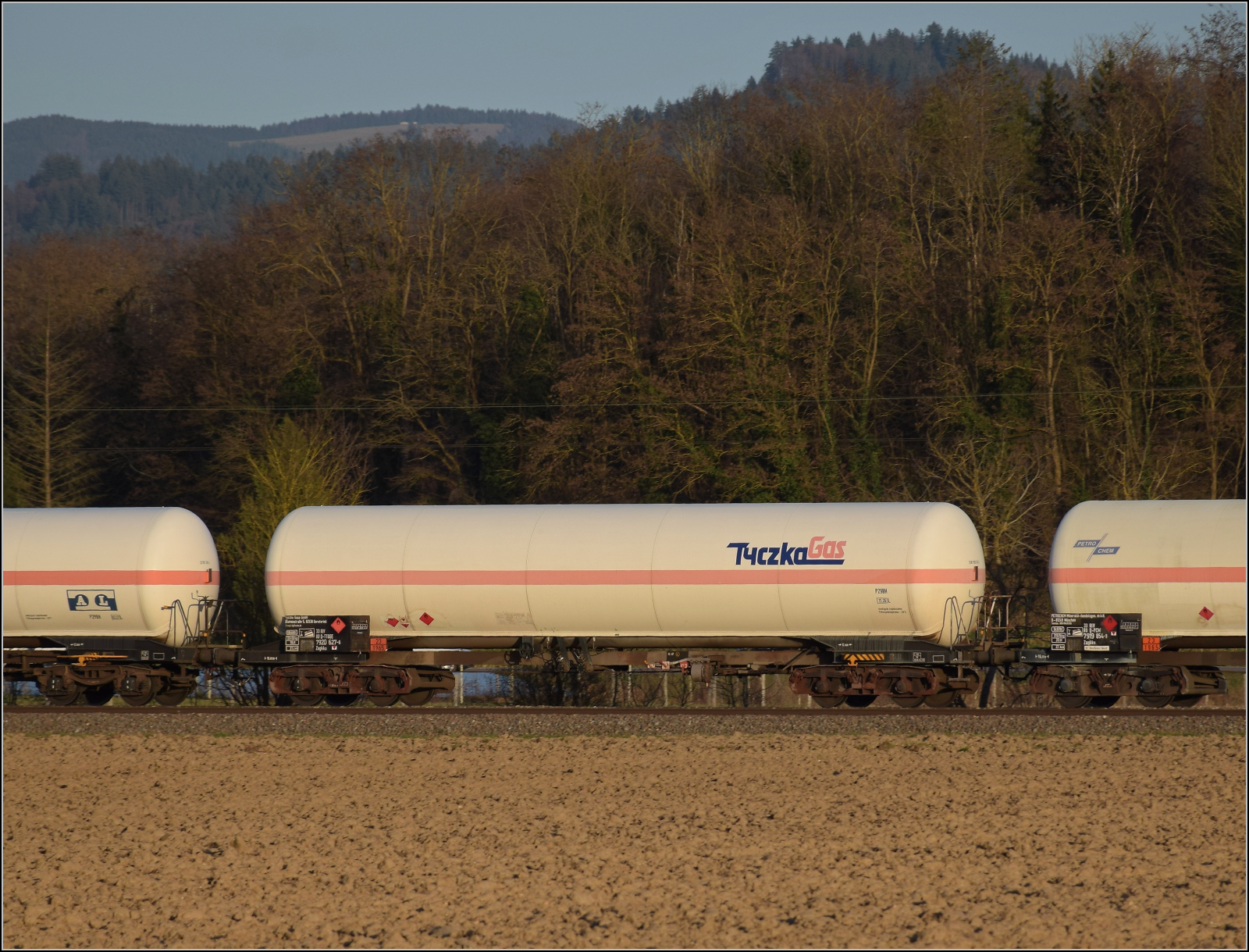 Im Bild der Gaskesselwagen 33 RIV 80 D-VTG 7923 093-8 Zagkks der VTG. 17.3.2026 Die Abendstimmung hat längst eingesetzt als ...