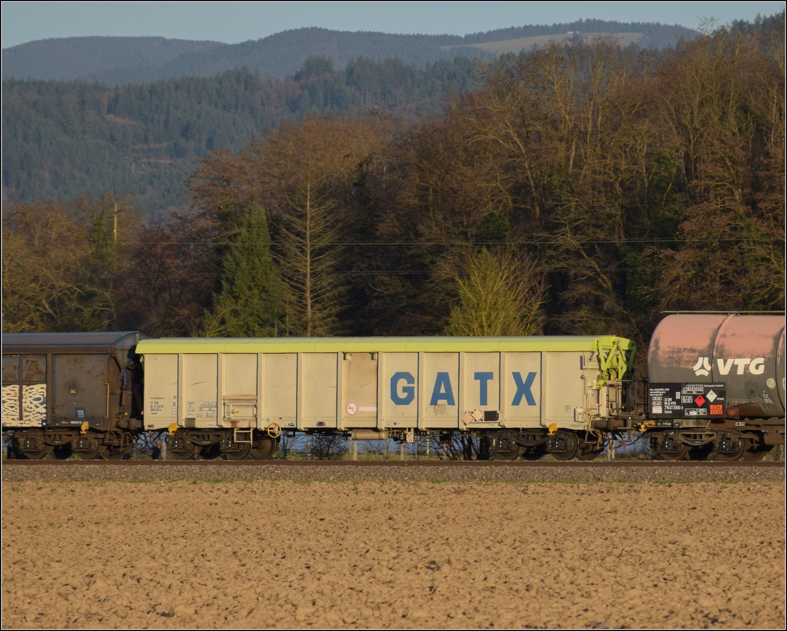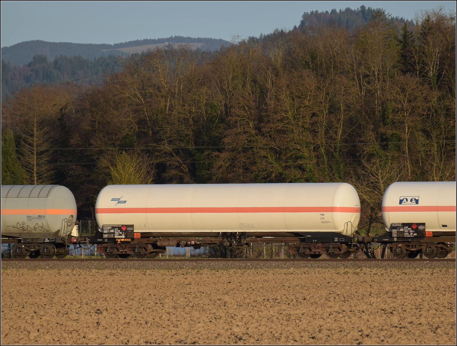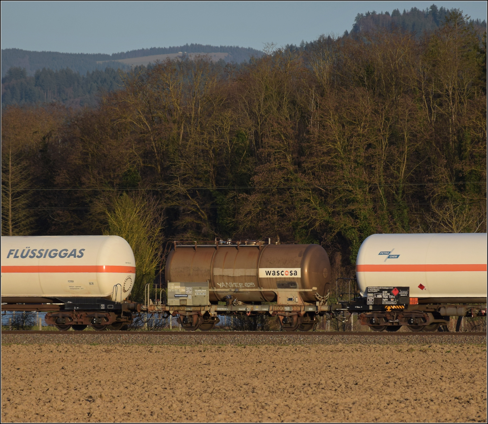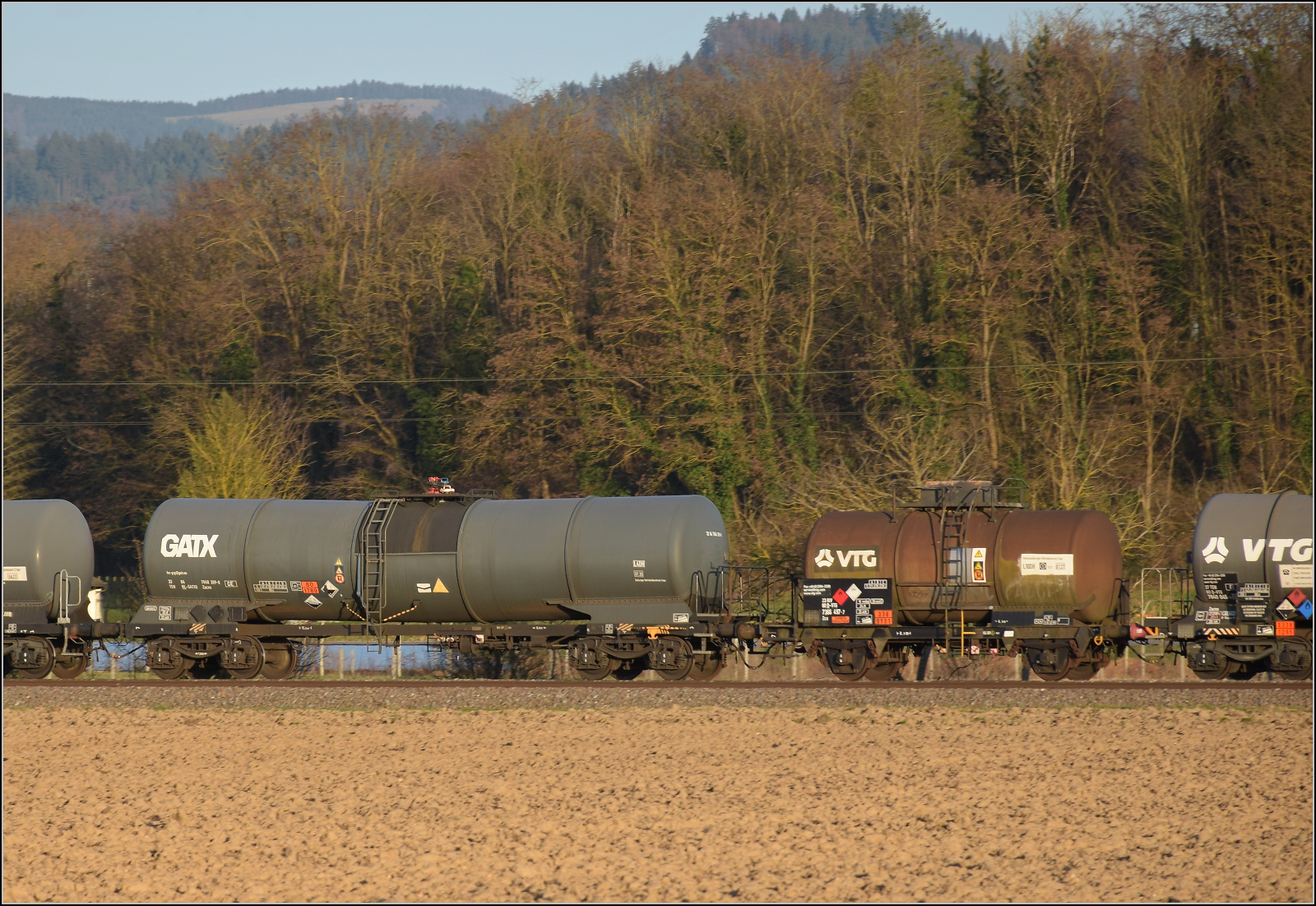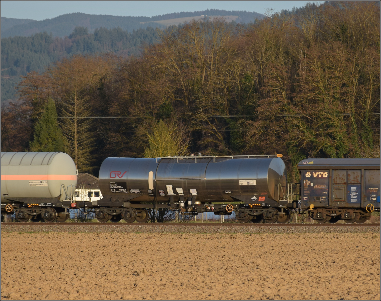 Im Bild der Gaskesselwagen 33 RIV 80 D-VTG 7923 093-8 Zagkks der VTG. 17.3.2026 Die Abendstimmung hat längst eingesetzt als ...